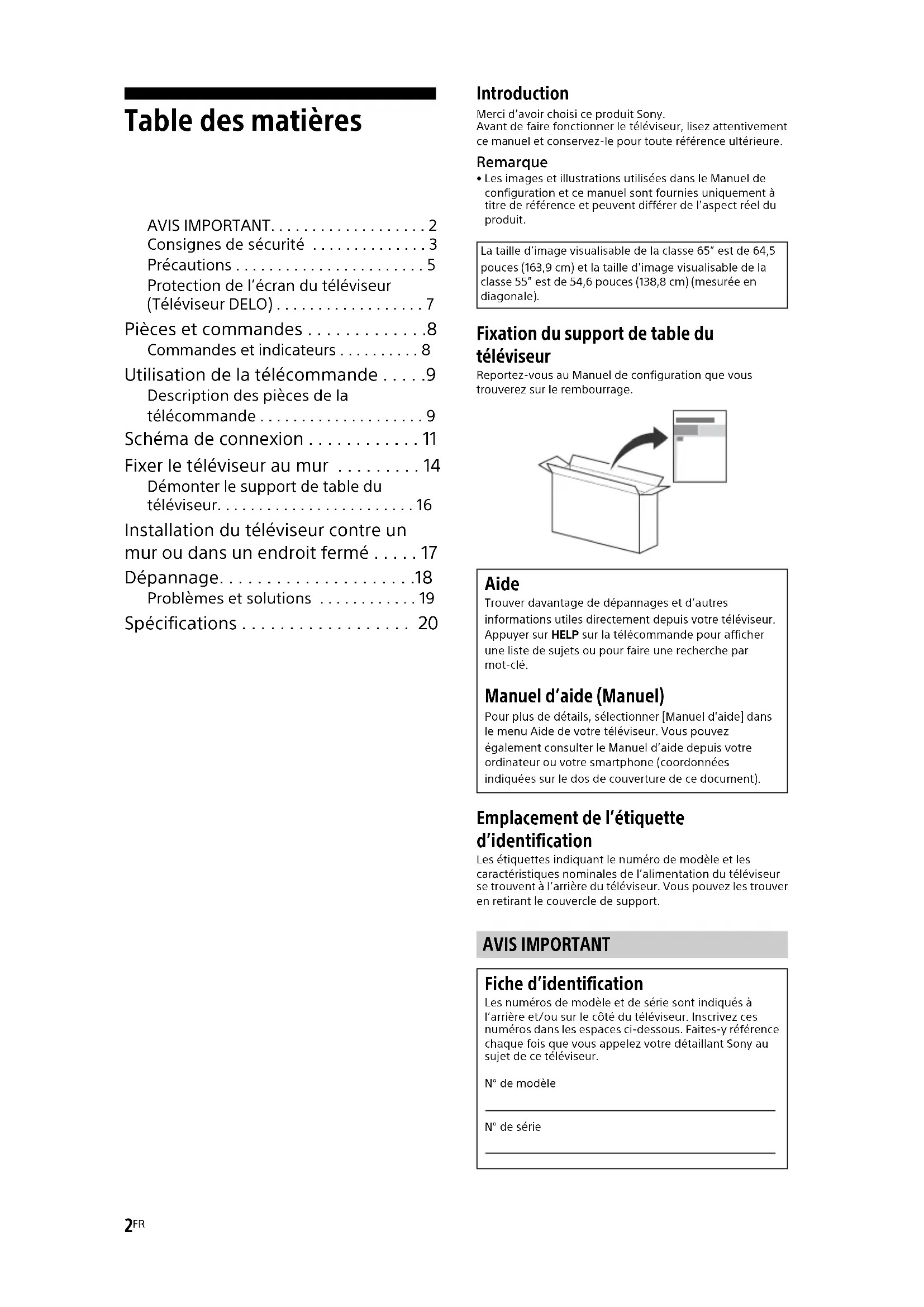- Les images et illustrations utilisées dans le Manuel de configuration et ce manuel sont fournies uniquement à titre de référence et peuvent différer de l’aspect réel du produit. Fixation du support de table du téléviseur Reportez-vous au Manuel de configuration que vous trouverez sur le rembourrage. Emplacement de l’étiquette d’identification Les étiquettes indiquant le numéro de modèle et les caractéristiques nominales de l’alimentation du téléviseur se trouvent à l’arrière du téléviseur. Vous pouvez les trouver en retirant le couvercle de support.La taille d’image visualisable de la classe 65” est de 64,5 pou ces (163,9 cm) et la taille d’image visualisable de la classe 55” est de 54,6 pouces (138,8 cm) (mesurée en diagonale). Aide Trouver davantage de dépannages et d’autres informations utiles directement depuis votre téléviseur. Appuyer sur HELP sur la télécommande pour afficher une liste de sujets ou pour faire une recherche par mot-clé. Manuel d’aide (Manuel) Pour plus de détails, sélectionner [Manuel d'aide] dans le menu Aide de votre téléviseur. Vous pouvez également consulter le Manuel d’aide depuis votre ordinateur ou votre smartphone (coordonnées indiquées sur le dos de couverture de ce document). AVIS IMPORTANT Fiche d’identification Les numéros de modèle et de série sont indiqués à l’arrière et/ou sur le côté du téléviseur. Inscrivez ces numéros dans les espaces ci-dessous. Faites-y référence chaque fois que vous appelez votre détaillant Sony au sujet de ce téléviseur.N° de modèleN° de série3