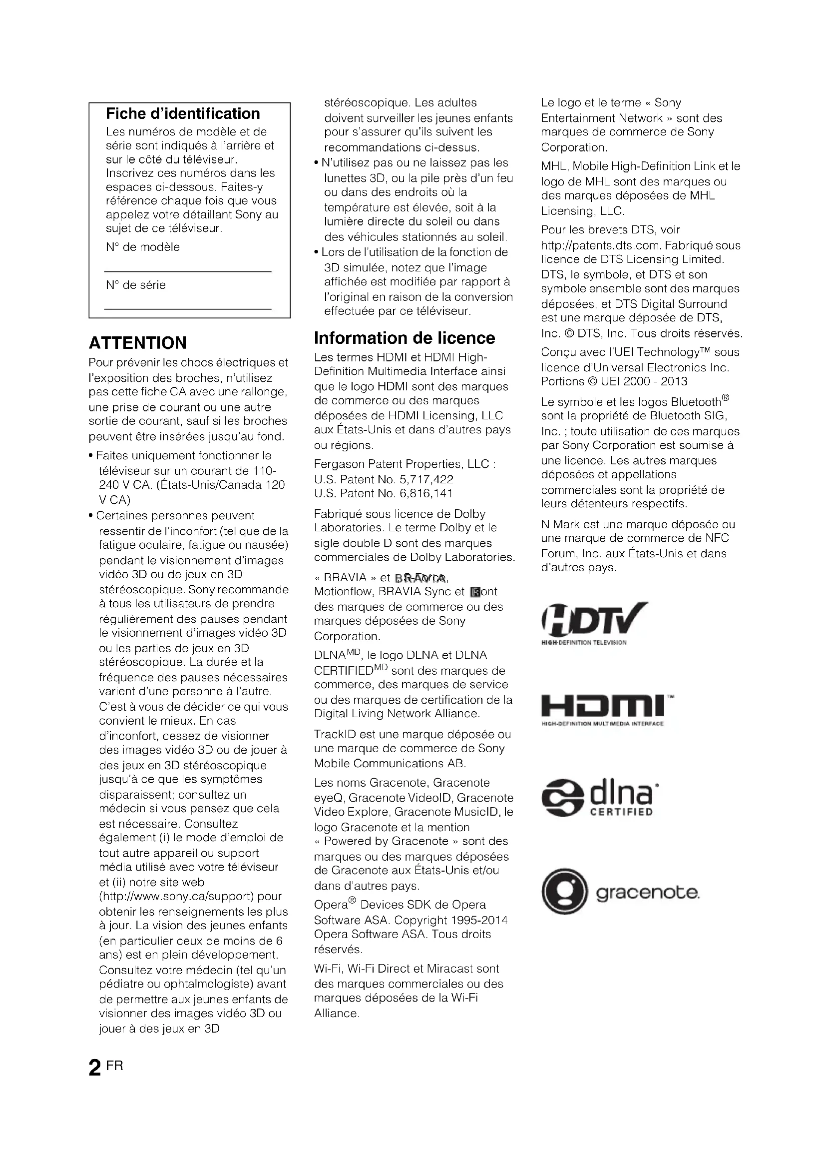 - Lors de l’utilisation de la fonction de 3D simulée, notez que l’image affichée est modifiée par rapport à l’original en raison de la conversion effectuée par ce téléviseur. Information de licence Les termes HDMI et HDMI High- Definition Multimedia Interface ainsi que le logo HDMI sont des marques de commerce ou des marques déposées de HDMI Licensing, LLC aux États-Unis et dans d’autres pays ou régions. Fergason Patent Properties, LLC : U.S. Patent No. 5,717,422 U.S. Patent No. 6,816,141 Fabriqué sous licence de Dolby Laboratories. Le terme Dolby et le sigle double D sont des marques commerciales de Dolby Laboratories. « BRAVIA » et , S-Force, Motionflow, BRAVIA Sync et sont des marques de commerce ou des marques déposées de Sony Corporation. DLNA
