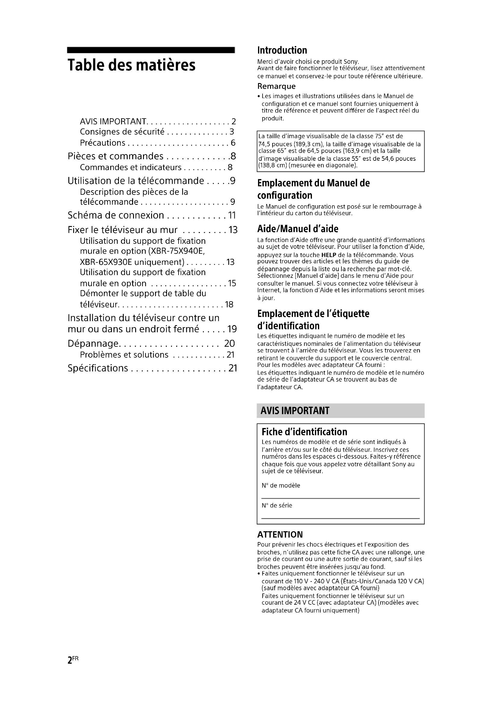 - Les images et illustrations utilisées dans le Manuel de configuration et ce manuel sont fournies uniquement à titre de référence et peuvent différer de l’aspect réel du produit. Emplacement du Manuel de configuration Le Manuel de configuration est posé sur le rembourrage à l’intérieur du carton du téléviseur. Aide/Manuel d’aide La fonction d’Aide offre une grande quantité d’informations au sujet de votre téléviseur. Pour utiliser la fonction d’Aide, appuyez sur la touche HELP de la télécommande. Vous pouvez trouver des articles et les thèmes du guide de dépannage depuis la liste ou la recherche par mot-clé. Sélectionnez [Manuel d’aide] dans le menu d’Aide pour consulter le manuel. Si vous connectez votre téléviseur à Internet, la fonction d’Aide et les informations seront mises à jour. Emplacement de l’étiquette d’identification Les étiquettes indiquant le numéro de modèle et les caractéristiques nominales de l’alimentation du téléviseur se trouvent à l’arrière du téléviseur. Vous les trouverez en retirant le couvercle du support et le couvercle central.Pour les modèles avec adaptateur CA fourni :Les étiquettes indiquant le numéro de modèle et le numéro de série de l’adaptateur CA se trouvent au bas de l’adaptateur CA. ATTENTION Pour prévenir les chocs électriques et l’exposition des broches, n’utilisez pas cette fiche CA avec une rallonge, une prise de courant ou une autre sortie de courant, sauf si les broches peuvent être insérées jusqu’au fond. • Faites uniquement fonctionner le téléviseur sur un courant de 110 V - 240 V CA (États-Unis/Canada 120 V CA) (sauf modèles avec adaptateur CA fourni) Faites uniquement fonctionner le téléviseur sur un courant de 24 V CC (avec adaptateur CA) (modèles avec adaptateur CA fourni uniquement)La taille d’image visualisable de la classe 75” est de 74,5 pouces (189,3 cm), la taille d’image visualisable de la classe 65” est de 64,5 pouces (163,9 cm) et la taille d’image visualisable de la classe 55” est de 54,6 pouces (138,8 cm) (mesurée en diagonale). AVIS IMPORTANT Fiche d’identification Les numéros de modèle et de série sont indiqués à l’arrière et/ou sur le côté du téléviseur. Inscrivez ces numéros dans les espaces ci-dessous. Faites-y référence chaque fois que vous appelez votre détaillant Sony au sujet de ce téléviseur.N° de modèleN° de série3