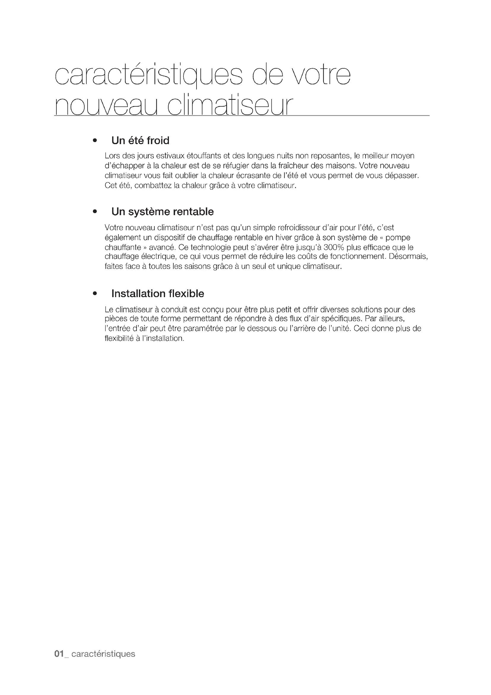 01_ caractéristiques caractéristiques de votre nouveau climatiseur t Un été froid Lors des jours estivaux étouffants et des longues nuits non reposantes, le meilleur moyen d’échapper à la chaleur est de se réfugier dans la fraîcheur des maisons. Votre nouveau climatiseur vous fait oublier la chaleur écrasante de l’été et vous permet de vous dépasser. Cet été, combattez la chaleur grâce à votre climatiseur. t Un système rentable Votre nouveau climatiseur n’est pas qu’un simple refroidisseur d’air pour l’été, c’est également un dispositif de chauffage rentable en hiver grâce à son système de « pompe chauffante » avancé. Ce technologie peut s’avérer être jusqu’à 300% plus efficace que le chauffage électrique, ce qui vous permet de réduire les coûts de fonctionnement. Désormais, faites face à toutes les saisons grâce à un seul et unique climatiseur. t Installation flexible Le climatiseur à conduit est conçu pour être plus petit et offrir diverses solutions pour des pièces de toute forme permettant de répondre à des flux d’air spécifiques. Par ailleurs, l’entrée d’air peut être paramétrée par le dessous ou l’arrière de l’unité. Ceci donne plus de flexibilité à l’installation.informations relatives à la sécurité _02 FRANÇAIS information de sûreté Avant d’user votre nouveau climatiseur, veuillez lire attentivement le manuel an de vous assurer que vous savez comment utiliser ecacement et en toute sécurité toutes les caractéristiques et fonctions de votre nouvel appareil). Les consignes suivantes couvrant plusieurs modèles, les caractéristiques de votre climatiseur peuvent légèrement diérer de celles décrites dans le présent manuel. Pour toute question, contactez le centre clientèle le plus proche ou trouvez de l’aide en ligne en visitant le site www.samsun.com. Symboles et consignes de sécurité importantes : ATTENTION Des pratiques dangereuses peuvent entraîner de sévères blessures corporelles voire la mort. AVERTISSEMENT Des pratiques dangereuses peuvent entraîner des blessures corporelles légères ou des dommages matériels. Suivez les instructions. Ne PAS tenter. Assurez-vous que la machine est reliée à la terre, an d'éviter tout choc électrique. Débranchez la prise de la prise murale. Ne PAS démonter.