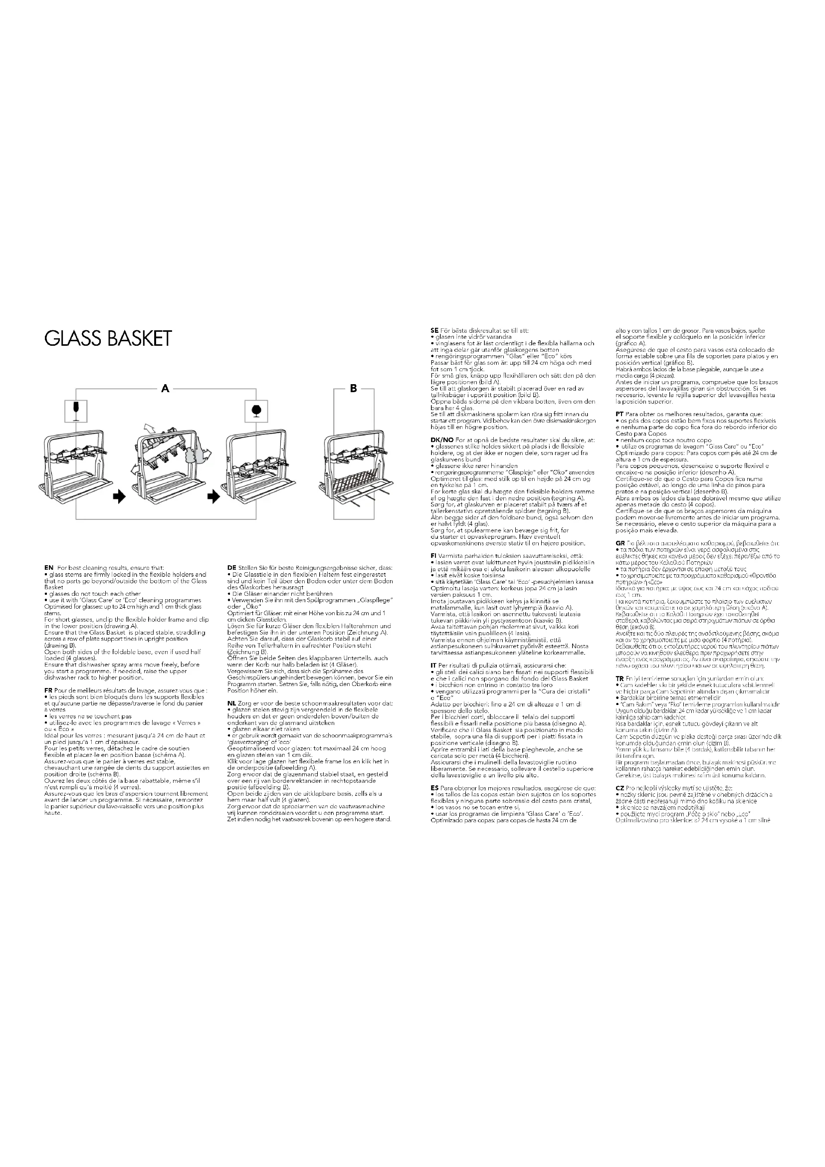 - utilisez-le avec les programmes de lavage «Verres» ou «Éco» Idéal pour les verres: mesurant jusqu’à 24cm de haut et un pied jusqu’à 1 cm d’épaisseur. Pour les petits verres, détachez le cadre de soutien flexible et placez-le en position basse (schéma A). Assurez-vous que le panier à verres est stable, chevauchant une rangée de dents du support assiettes en position droite (schéma B). Ouvrez les deux côtés de la base rabattable, même s’il n’est rempli qu’à moitié (4 verres). Assurez-vous que les bras d’aspersion tournent librement avant de lancer un programme. Si nécessaire, remontez le panier supérieur du lave-vaisselle vers une position plus haute. DE Stellen Sie für beste Reinigungsergebnisse sicher, dass:
