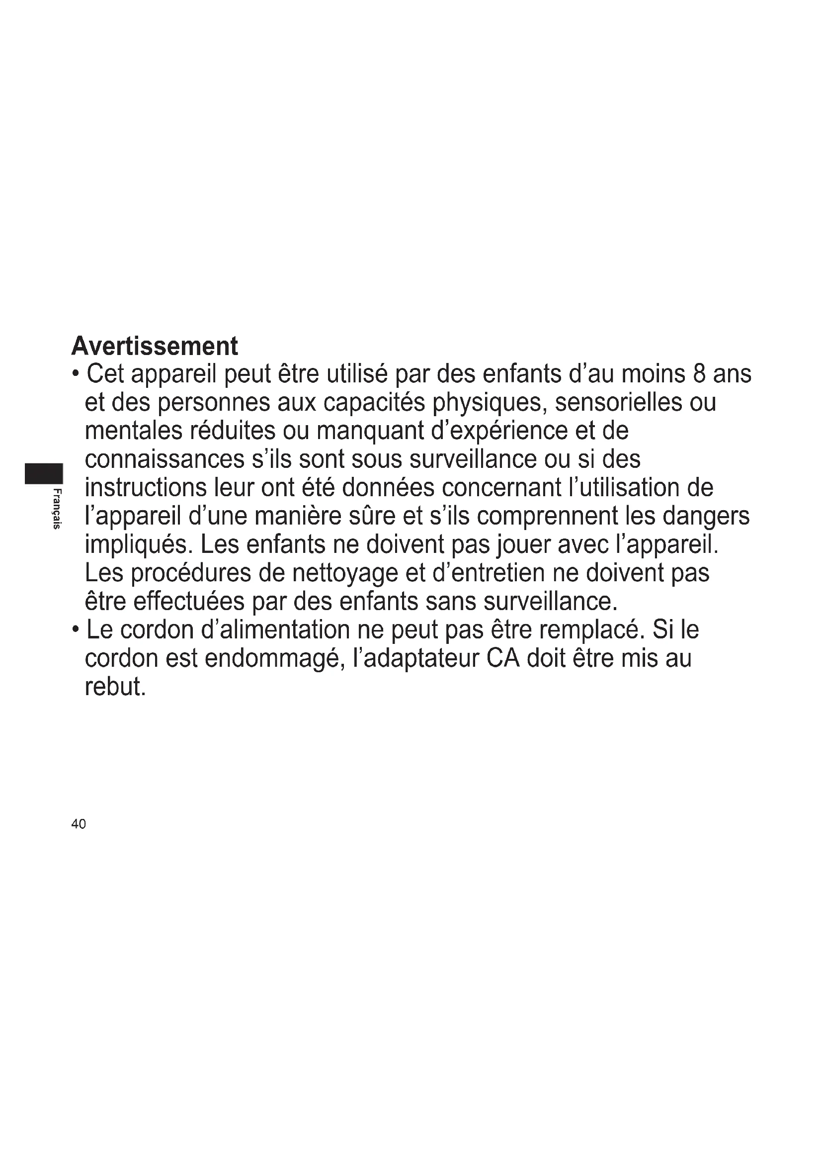 - Cetappareilpeutêtreutilisépardesenfantsd’aumoins8ans etdespersonnesauxcapacitésphysiques,sensoriellesou mentalesréduitesoumanquantd’expérienceetde connaissancess’ilssontsoussurveillanceousides instructionsleurontétédonnéesconcernantl’utilisationde l’appareild’unemanièresûreets’ilscomprennentlesdangers impliqués.Lesenfantsnedoiventpasjoueravecl’appareil. Lesprocéduresdenettoyageetd’entretiennedoiventpas êtreeffectuéespardesenfantssanssurveillance.