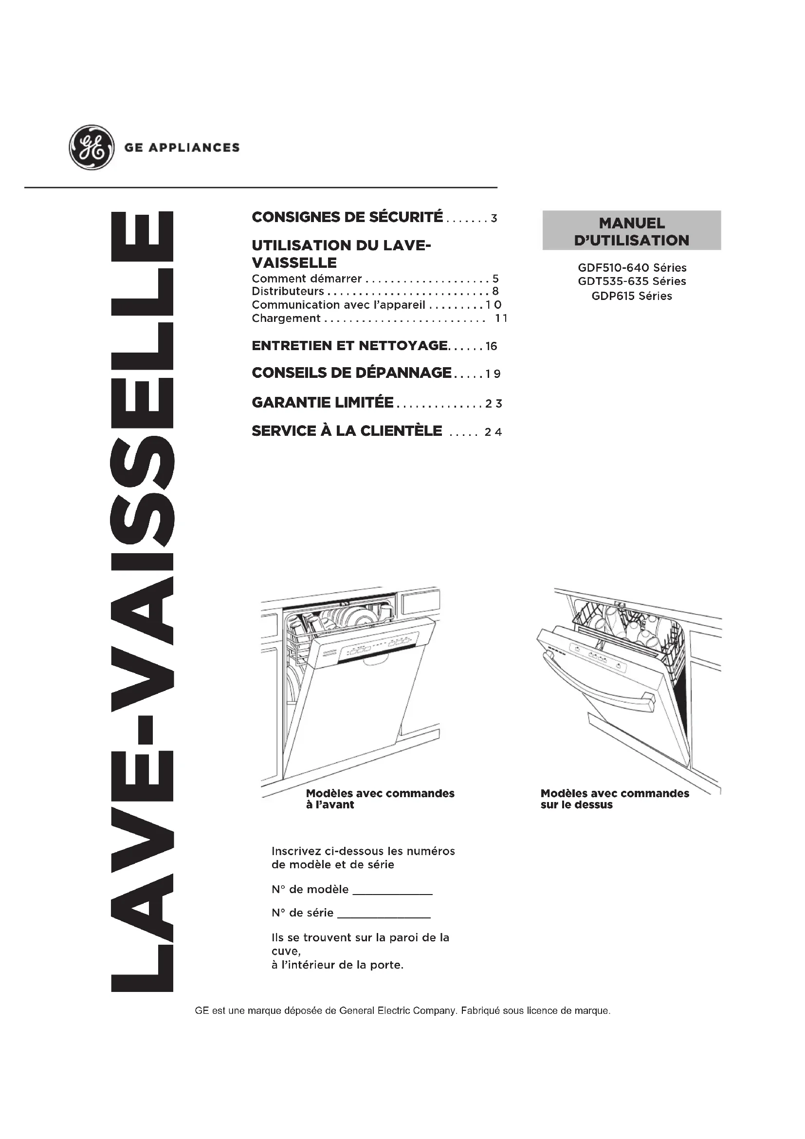 GDF510-640 Séries GDT535-635 Séries GDP615 Séries Modèles avec commandes à l’avant Modèles avec commandes sur le dessus2 49-55122-4 NOUS VOUS REMERCIONS D’ACCUEILLIR GE APPLIANCES CHEZ VOUS Que vous ayez grandi avec GE Appliances ou qu’il s’agisse de votre première acquisition, nous sommes heureux de vous accueillir dans notre famille. Nous sommes fiers du savoir-faire, de l’innovation et de l’esthétique qui composent chaque appareil GE Appliances, et nous pensons que vous le serez aussi. Dans cette optique, nous vous rappelons que l’enregistrement de votre électroménager vous assure la communication de renseignements importants sur le produit et la garantie lorsque vous en avez besoin. Enregistrez votre électroménager GE en ligne dès maintenant. Des sites Web et des numéros de téléphone utiles figurent dans la section Soutien au consommateur de ce manuel d’utilisation. Vous pouvez aussi poster la fiche de garantie préimprimée incluse dans l’emballage.49-55122-4 3