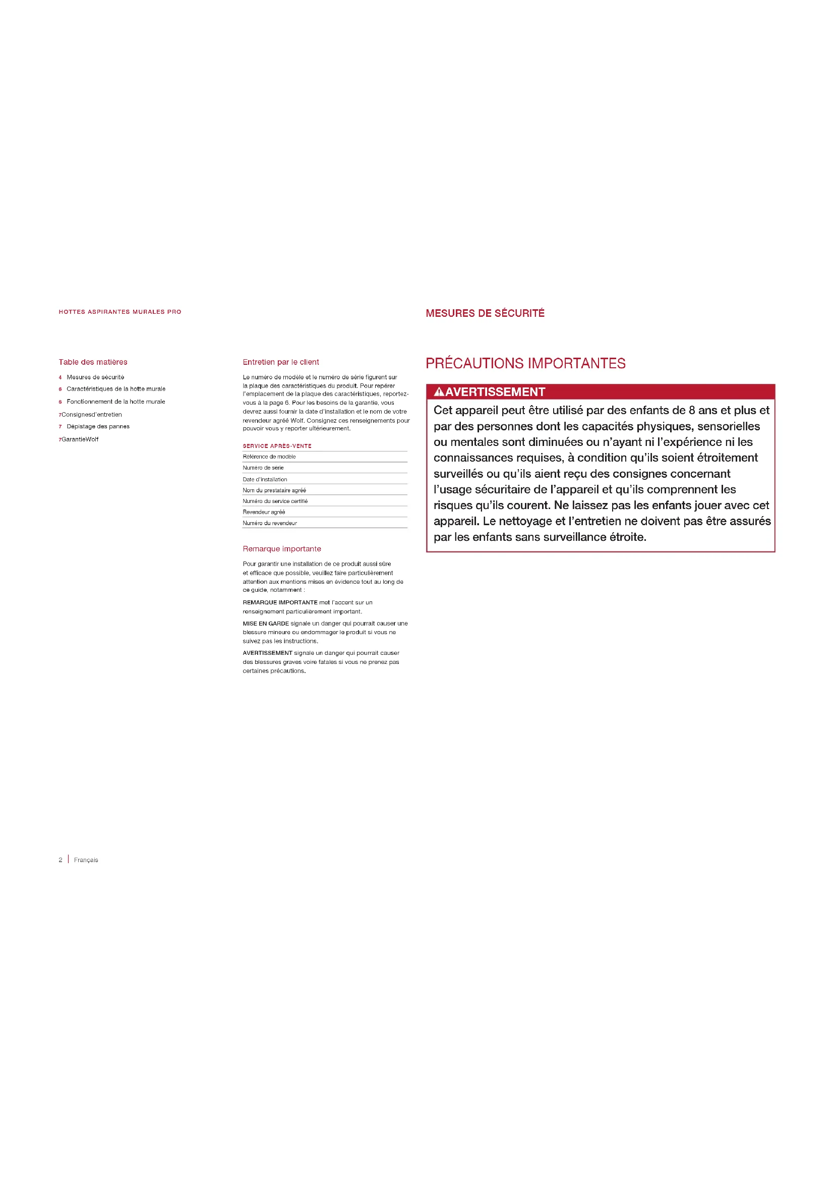 AVERTISSEMENT Cet appareil peut être utilisé par des enfants de 8 ans et plus et par des personnes dont les capacités physiques, sensorielles ou mentales sont diminuées ou n’ayant ni l’expérience ni les connaissances requises, à condition qu’ils soient étroitement surveillés ou qu’ils aient reçu des consignes concernant l’usage sécuritaire de l’appareil et qu’ils comprennent les risques qu’ils courent. Ne laissez pas les enfants jouer avec cet appareil. Le nettoyage et l’entretien ne doivent pas être assurés par les enfants sans surveillance étroite. Table des matières 4 Mesures de sécurité6 Caractéristiques de la hotte murale6 Fonctionnement de la hotte murale7 Consignes d’entretien7 Dépistage des pannes7 Garantie WolfHOTTES ASPIRANTES MURALES PRO Entretien par le client Le numéro de modèle et le numéro de série gurent sur la plaque des caractéristiques du produit. Pour repérer l’emplacement de la plaque des caractéristiques, reportez-vous à la page 6. Pour les besoins de la garantie, vous devrez aussi fournir la date d’installation et le nom de votre revendeur agréé Wolf. Consignez ces renseignements pour pouvoir vous y reporter ultérieurement.SERVICE APRÈS-VENTERéférence de modèleNuméro de sérieDate d’installationNom du prestataire agrééNuméro du service certiéRevendeur agrééNuméro du revendeur Remarque importante Pour garantir une installation de ce produit aussi sûre et efcace que possible, veuillez faire particulièrement attention aux mentions mises en évidence tout au long de ce guide, notamment :REMARQUE IMPORTANTE met l’accent sur un renseignement particulièrement important. MISE EN GARDE signale un danger qui pourrait causer une blessure mineure ou endommager le produit si vous ne suivez pas les instructions.AVERTISSEMENT signale un danger qui pourrait causer des blessures graves voire fatales si vous ne prenez pas certaines précautions. MESURES DE SÉCURITÉwolfappliance.com