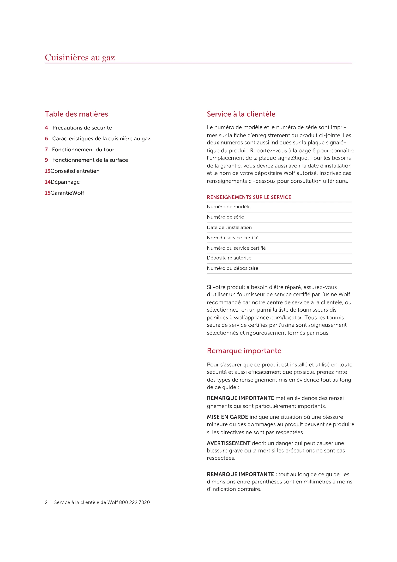 Comment commencer Nous savons que vous êtes impatient de commencer à cuisiner, mais avant de le faire, veuillez prendre quelques instants pour lire ce guide d’utilisation et d’entretien. Que vous soyez un cuisinier occasionnel ou un chef expert, il vous sera bénéfique de vous familiariser avec les pratiques de sécurité, les caractéristiques, le fonctionnement et les recommandations d’entretien de votre cuisinière au gaz de Wolf.
