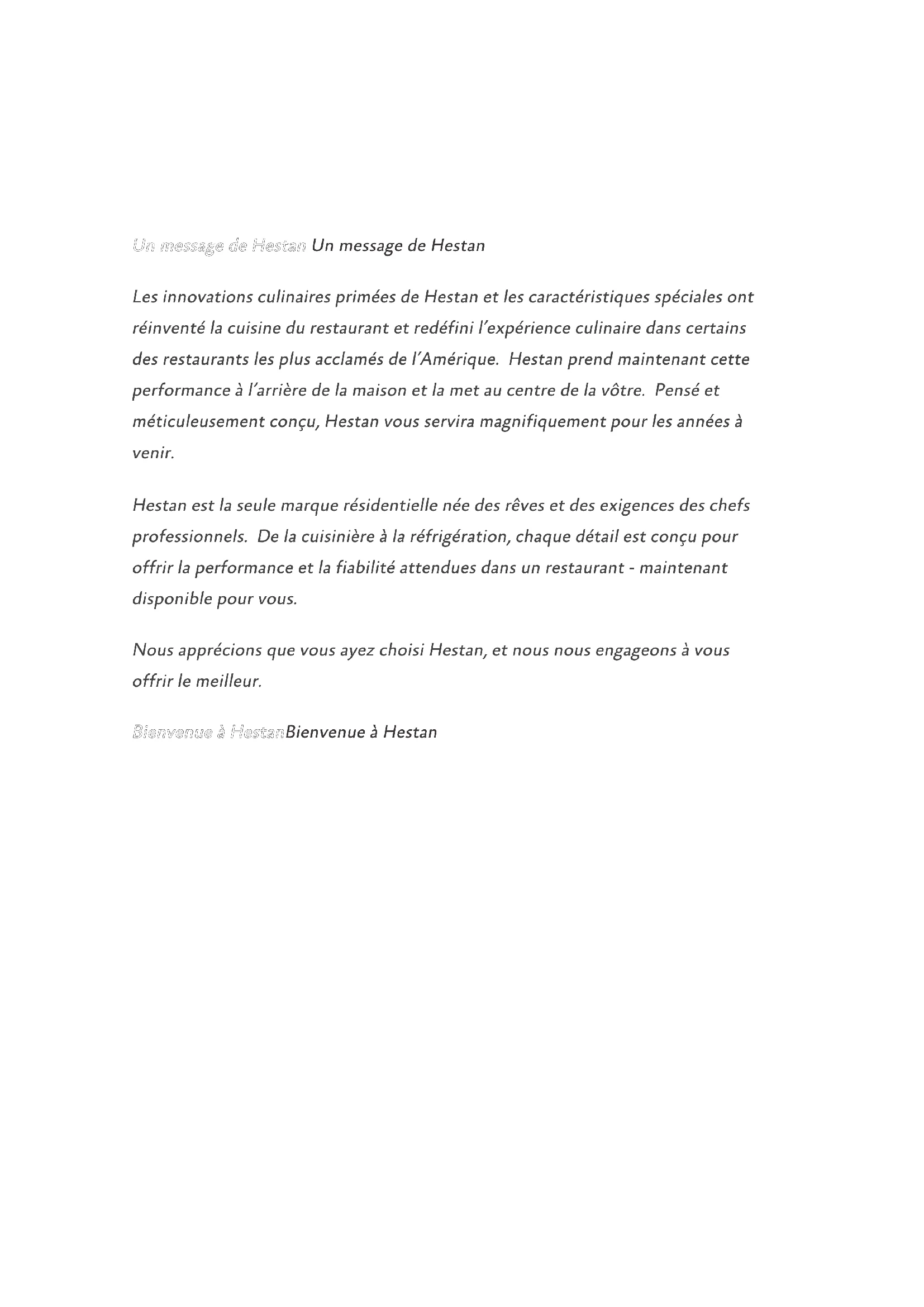 CECI INDIQUE QUE L’INOBSERVATION DE CET AVERTISSEMENT PEUT ENTRAÎNER DES BLESSURES GRAVES VOIRE MORTELLES. LISEZ ATTENTIVEMENT ET COMPLÈTEMENT CES INSTRUCTIONS AVANT D’INSTALLER OU D’UTILISER VOTRE APPAREIL AFIN DE RÉDUIRE LES RISQUES D’INCENDIE, DE BRÛLURE OU D’AUTRES BLESSURES. CONSERVER CE MANUEL POUR RÉFÉRENCE FUTURE. INSTALLATEUR: LAISSER CE MANUEL AVEC LE PROPRIÉTAIRE DE L’APPAREIL. PROPRIÉTAIRE: CONSERVEZ CE MANUEL POUR RÉFÉRENCE FUTURE. Ne pas entreposer ou utiliser d’essence ou tout autre liquide ou gaz inflammable à proximité de cet appareil ou de tout autre appareil. L’installation et le service doivent être effectués par un installateur qualifié ou une agence de service. NE PAS RÉPARER, REMPLACER OU ENLEVER TOUTE PIÈCE DE L’APPAREIL, SAUF SI SPÉCIFIQUEMENT RECOMMANDÉ DANS LES MANUELS. UNE INSTALLATION, UN ENTRETIEN OU UNE MAINTENANCE INCORRECTS PEUT ENTRAÎNER DES BLESSURES OU DES DOMMAGES MATÉRIELS. CONSULTEZ CE MANUEL DE L’ORIENTATION. TOUS LES AUTRES SERVICES DEVRAIENT ÊTRE EFFECTUÉS PAR UN TECHNICIEN DE SERVICE HESTAN AUTORISÉ. LE NON-RESPECT À LA LETTRE DE CES INSTRUCTIONS PEUT CAUSER UN INCENDIE OU UNE EXPLOSION, QUI POURRAIT ENTRAÎNER DES DOMMAGES MATÉRIELS, DES BLESSURES OU LA MORT. CECI INDIQUE QUE L’INOBSERVATION DE CET AVERTISSEMENT PEUT ENTRAÎNER DES BLESSURES MINEURES OU MODÉRÉES. CECI INDIQUE QUE L’INOBSERVATION DE CET AVERTISSEMENT PEUT ENTRAÎNER DES DOMMAGES DE L’APPAREIL OU DES DÉGÂTS MATÉRIELS.Un message de Hestan Un message de Hestan Les innovations culinaires primées de Hestan et les caractéristiques spéciales ont réinventé la cuisine du restaurant et redéfini l’expérience culinaire dans certains des restaurants les plus acclamés de l’Amérique. Hestan prend maintenant cette performance à l’arrière de la maison et la met au centre de la vôtre. Pensé et méticuleusement conçu, Hestan vous servira magnifiquement pour les années à venir. Hestan est la seule marque résidentielle née des rêves et des exigences des chefs professionnels. De la cuisinière à la réfrigération, chaque détail est conçu pour offrir la performance et la fiabilité attendues dans un restaurant - maintenant disponible pour vous. Nous apprécions que vous ayez choisi Hestan, et nous nous engageons à vous offrir le meilleur. Bienvenue à HestanBienvenue à HestanFR ©2020 Hestan Commercial Corporation