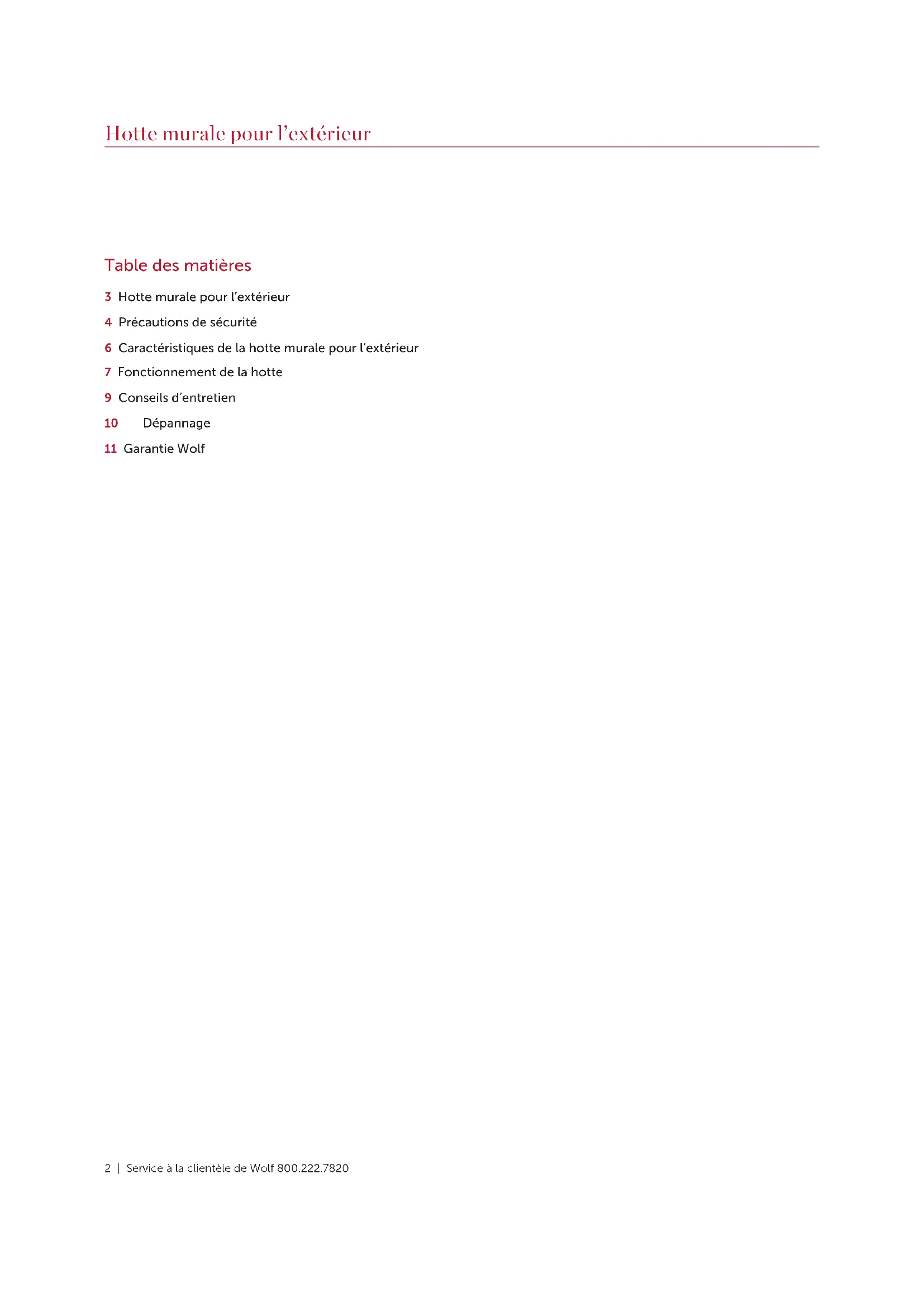 RESSORT FILTRE GODET DE GRAISSE Filtres Fonctionnement de la hottewolfappliance.com | 9 Conseils d’entretien Conseils d’entretien NETTOYAGE Acier inoxydable Utilisez un nettoyant non abrasif pour l’acier inoxydable et appliquez-le avec un chion doux non pelucheux. Pour faire ressortir le lustre naturel, essuyez légèrement la surface avec un chion en microfi- bres humecté d’eau suivi d’un chamois à polir sec. Suivez toujours le grain de l’acier inoxydable. Boutons de commande Avec un chion humide, essuyez avec un détergent doux ou un dégraissant en aérosol. Rincez et séchez. REMARQUE IMPORTANTE : Ne pulvérisez pas les produits à nettoyer directement sur les boutons de contrôle. Filtres Godets de graisse Les filtres peuvent être lavés dans le lave-vaisselle et sont conçus pour être insérés dans la plupart de ces derniers. Essuyez les filtres et les godets de graisse pour éliminer l’excédent de graisse avant de les placer dans le lave-vaisselle.10 | Service à la clientèle de Wolf 800.222.7820 SERVICE