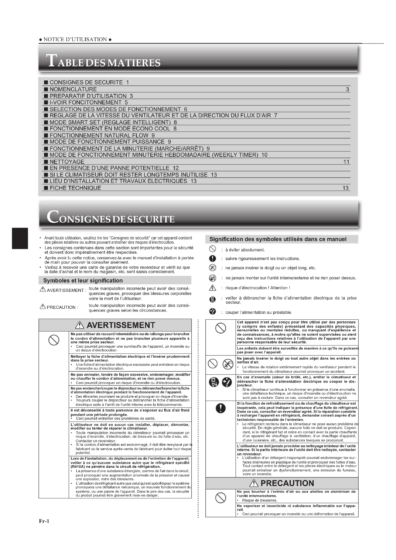 - La vitesse de rotation extrêmement rapide du ventilateur pendant le fonctionnement du climatiseur pourrait provoquer un accident. En cas d’anomalie (odeur de brûlé, etc.), arrêter le climatiseur et débrancher la fi che d’alimentation électrique ou couper le dis- joncteur.• Si le climatiseur continue à fonctionner en présence d’une anomalie, une défaillance technique, un risque d’incendie ou d’électrocution ne sont pas à exclure. Dans ce cas, consulter un revendeur agréé.Si la fonction de refroidissement ou de chauffage du climatiseur est inopérante, cela peut indiquer la présence d’une fuite de réfrigérant. Dans ce cas, consulter un revendeur agréé. Si la réparation consiste à recharger l’appareil en réfrigérant, demander conseil auprès d’un technicien responsable de l’entretien.• Le réfrigérant contenu dans le climatiseur ne pose aucun problème de sécurité. En règle générale, aucune fuite ne doit se produire. Cepen-dant, si le réfrigérant fuit et entre en contact avec la partie chauffante d’un appareil de chauffage à ventilation, d’un chauffage d’appoint, d’une cuisinière, etc., des substances toxiques se produiront.L’utilisateur ne doit jamais procéder au nettoyage intérieur de l’unité interne. Si la partie intérieure de l’unité doit être nettoyée, contacter un revendeur.• L’utilisation d’un détergent inapproprié pourrait endommager les sur-faces intérieures en plastique de l’unité et provoquer des fuites d’eau. Tout contact entre le détergent et les pièces électriques ou le moteur pourrait entraîner un dysfonctionnement, une émission de fumées, voire un incendie. PRECAUTION Ne pas toucher à l’entrée d’air ou aux ailettes en aluminium de l’unité interne/externe.• Risque de blessures. Ne vaporiser ni insecticide ni substance infl ammable sur l’appa- reil.• Ceci pourrait provoquer un incendie ou une déformation de l’appareil. Signifi cation des symboles utilisés dans ce manuel : à éviter absolument. : suivre rigoureusement les instructions. : ne jamais insérer le doigt ou un objet long, etc. ne jamais monter sur l’unité interne/externe et ne rien poser dessus. : risque d’électrocution ! Attention ! : veiller à débrancher la fi che d’alimentation électrique de la prise secteur. : couper l’alimentation au préalable.
