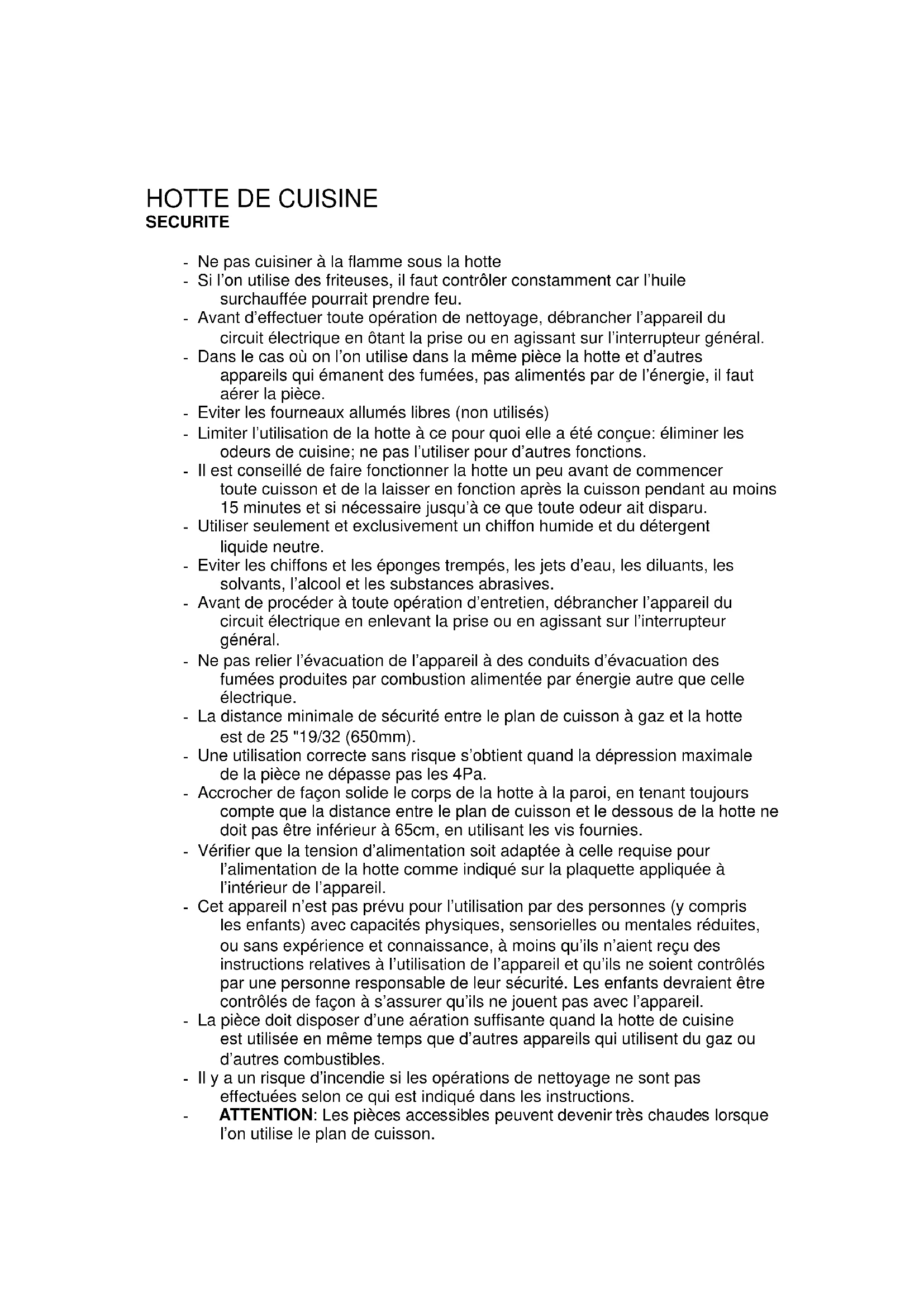 SECURITE - Ne pas cuisiner à la flamme sous la hotte - Si l’on utilise des friteuses, il faut contrôler constamment car l’huile surchauffée pourrait prendre feu. - Avant d’effectuer toute opération de nettoyage, débrancher l’appareil du circuit électrique en ôtant la prise ou en agissant sur l’interrupteur général. - Dans le cas où on l’on utilise dans la même pièce la hotte et d’autres appareils qui émanent des fumées, pas alimentés par de l’énergie, il faut aérer la pièce. - Eviter les fourneaux allumés libres (non utilisés) - Limiter l’utilisation de la hotte à ce pour quoi elle a été conçue: éliminer les odeurs de cuisine; ne pas l’utiliser pour d’autres fonctions. - Il est conseillé de faire fonctionner la hotte un peu avant de commencer toute cuisson et de la laisser en fonction après la cuisson pendant au moins 15 minutes et si nécessaire jusqu’à ce que toute odeur ait disparu. - Utiliser seulement et exclusivement un chiffon humide et du détergent liquide neutre. - Eviter les chiffons et les éponges trempés, les jets d’eau, les diluants, les solvants, l’alcool et les substances abrasives. - Avant de procéder à toute opération d’entretien, débrancher l’appareil du circuit électrique en enlevant la prise ou en agissant sur l’interrupteur général. - Ne pas relier l’évacuation de l’appareil à des conduits d’évacuation des fumées produites par combustion alimentée par énergie autre que celle électrique. - La distance minimale de sécurité entre le plan de cuisson à gaz et la hotte est de 25 "19/32 (650mm). - Une utilisation correcte sans risque s’obtient quand la dépression maximale de la pièce ne dépasse pas les 4Pa. - Accrocher de façon solide le corps de la hotte à la paroi, en tenant toujours compte que la distance entre le plan de cuisson et le dessous de la hotte ne doit pas être inférieur à 65cm, en utilisant les vis fournies. - Vérifier que la tension d’alimentation soit adaptée à celle requise pour l’alimentation de la hotte comme indiqué sur la plaquette appliquée à l’intérieur de l’appareil. - Cet appareil n’est pas prévu pour l’utilisation par des personnes (y compris les enfants) avec capacités physiques, sensorielles ou mentales réduites, ou sans expérience et connaissance, à moins qu’ils n’aient reçu des instructions relatives à l’utilisation de l’appareil et qu’ils ne soient contrôlés par une personne responsable de leur sécurité. Les enfants devraient être contrôlés de façon à s’assurer qu’ils ne jouent pas avec l’appareil. - La pièce doit disposer d’une aération suffisante quand la hotte de cuisine est utilisée en même temps que d’autres appareils qui utilisent du gaz ou d’autres combustibles. - Il y a un risque d’incendie si les opérations de nettoyage ne sont pas effectuées selon ce qui est indiqué dans les instructions. - ATTENTION: Les pièces accessibles peuvent devenir très chaudes lorsque l’on utilise le plan de cuisson.Nettoyage - Utiliser seulement et exclusivement un chiffon humide et du détergent liquide neutre. - Eviter les chiffons et les éponges trempés, les jets d’eau, les diluants, les solvants, l’alcool et les substances abrasives. - Il faut nettoyer la hotte au moins une fois par mois. AVERTISSEMENT Avant d’effectuer toute opération de nettoyage, débrancher l’appareil du circuit électrique en ôtant la prise ou en agissant sur l’interrupteur général. Introduction Ces instructions ont été conçues pour illustrer les détails techniques de votre hotte et pour vous faire connaître son utilisation. Vu que ces informations concernent plusieurs modèles de hotte, il se peut que l’on fasse référence à des composants qui ne font pas partie de la hotte que l’on est en train d’installer. La hotte doit être utilisée pour évacuer les vapeurs et les odeurs de la cuisine hors de l’habitation. Les raccords qui envoient l’air peuvent varier de pays à pays. Nous nous réservons le droit de modifier le produit sans aucun préavis, toujours dans l’objectif de l’améliorer.