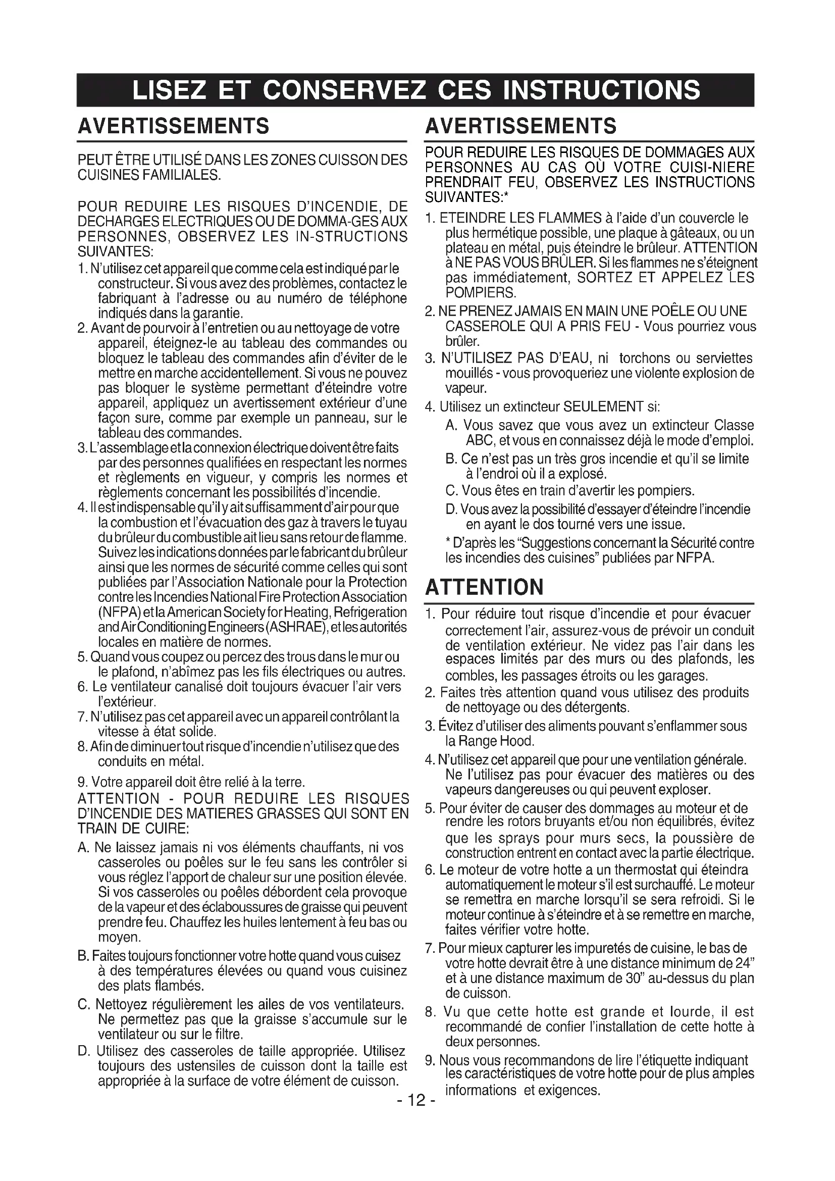 D’INCENDIE DES MATIERES GRASSES QUI SONT EN TRAIN DE CUIRE: A. Ne laissez jamais ni vos éléments chauffants, ni vos casseroles ou poêles sur le feu sans les contrôler si vous réglez l’apport de chaleur sur une position élevée. Si vos casseroles ou poêles débordent cela provoque de la vapeur et des éclaboussures de graisse qui peuvent prendre feu. Chauffez les huiles lentement à feu bas ou moyen. B. Faites toujours fonctionner votre hotte quand vous cuisez à des températures élevées ou quand vous cuisinez des plats flambés. C. Nettoyez régulièrement les ailes de vos ventilateurs. Ne permettez pas que la graisse s’accumule sur le ventilateur ou sur le filtre. D. Utilisez des casseroles de taille appropriée. Utilisez toujours des ustensiles de cuisson dont la taille est appropriée à la surface de votre élément de cuisson. AVERTISSEMENTS POUR REDUIRE LES RISQUES DE DOMMAGES AUX