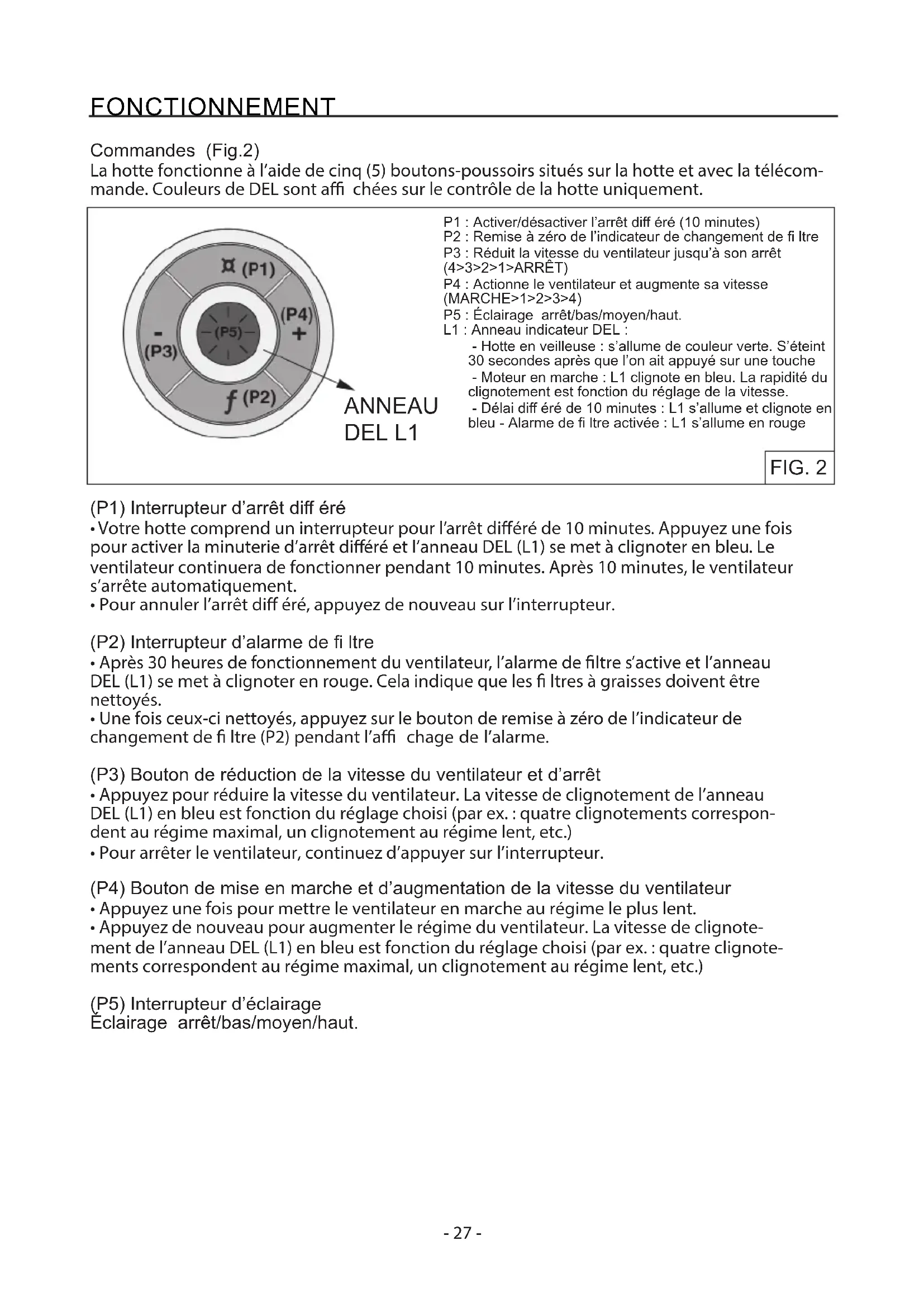 La hotte fonctionne à l'aide de cinq (5) boutons-poussoirs situés sur la hotte et avec la télécommande. Les couleurs des DEL sont affichées sur le contrôle de la hotte uniquement.