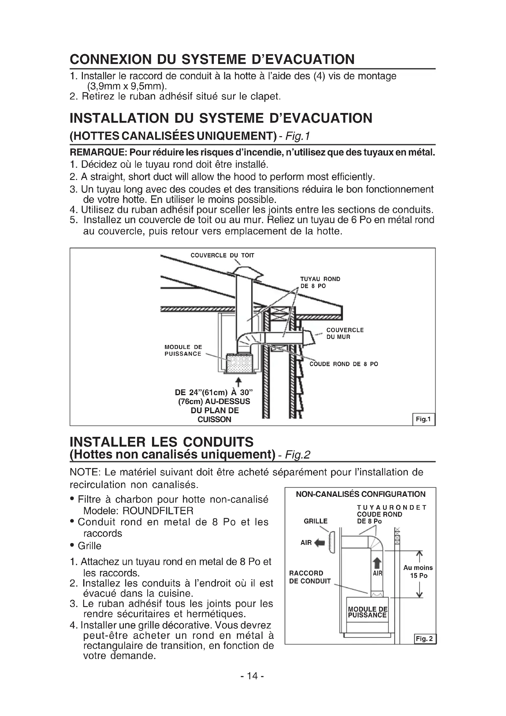COUVERCLE DU TOITTUYAU RONDDE 8 POCOUVERCLEDU MURMODULE DEPUISSANCEDE 24”(61cm) À 30”(76cm) AU-DESSUSDU PLAN DECUISSONCOUDE ROND DE 8 POFig.1 AIR AIR GRILLETUYAURONDETCOUDE RONDDE 8 PoRACCORDMODULE DEAu moins15 PoPUISSANCEDE CONDUIT Fig. 2NON-CANALISÉS CONFIGURATION