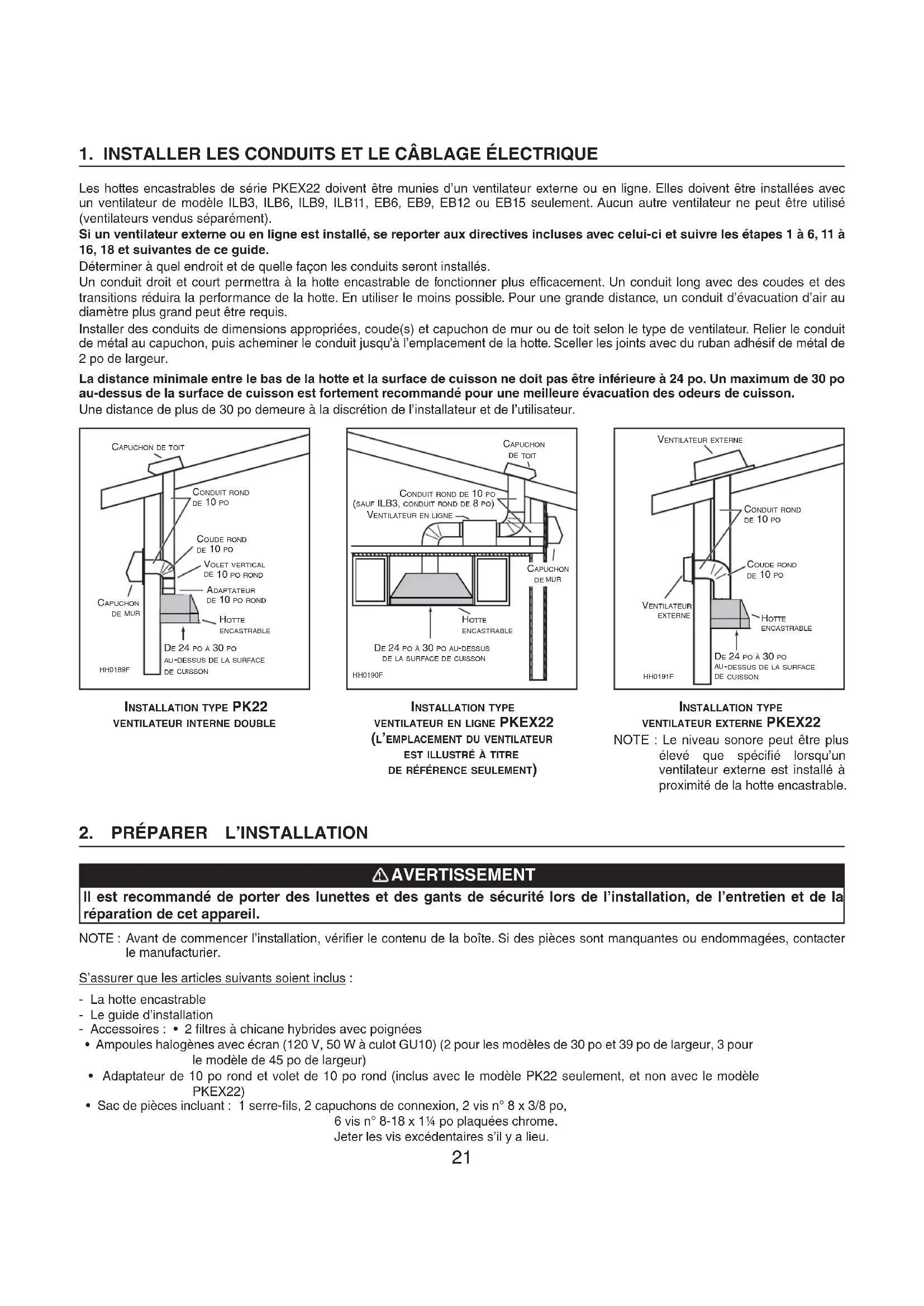 - Les modeles PKEX22 utilisés avec les ventilateurs ILB3, ILB6 ou EB6, doivent être installés au-dessus d'une cusinière produitant un maximum de 60 000 Btu/h.