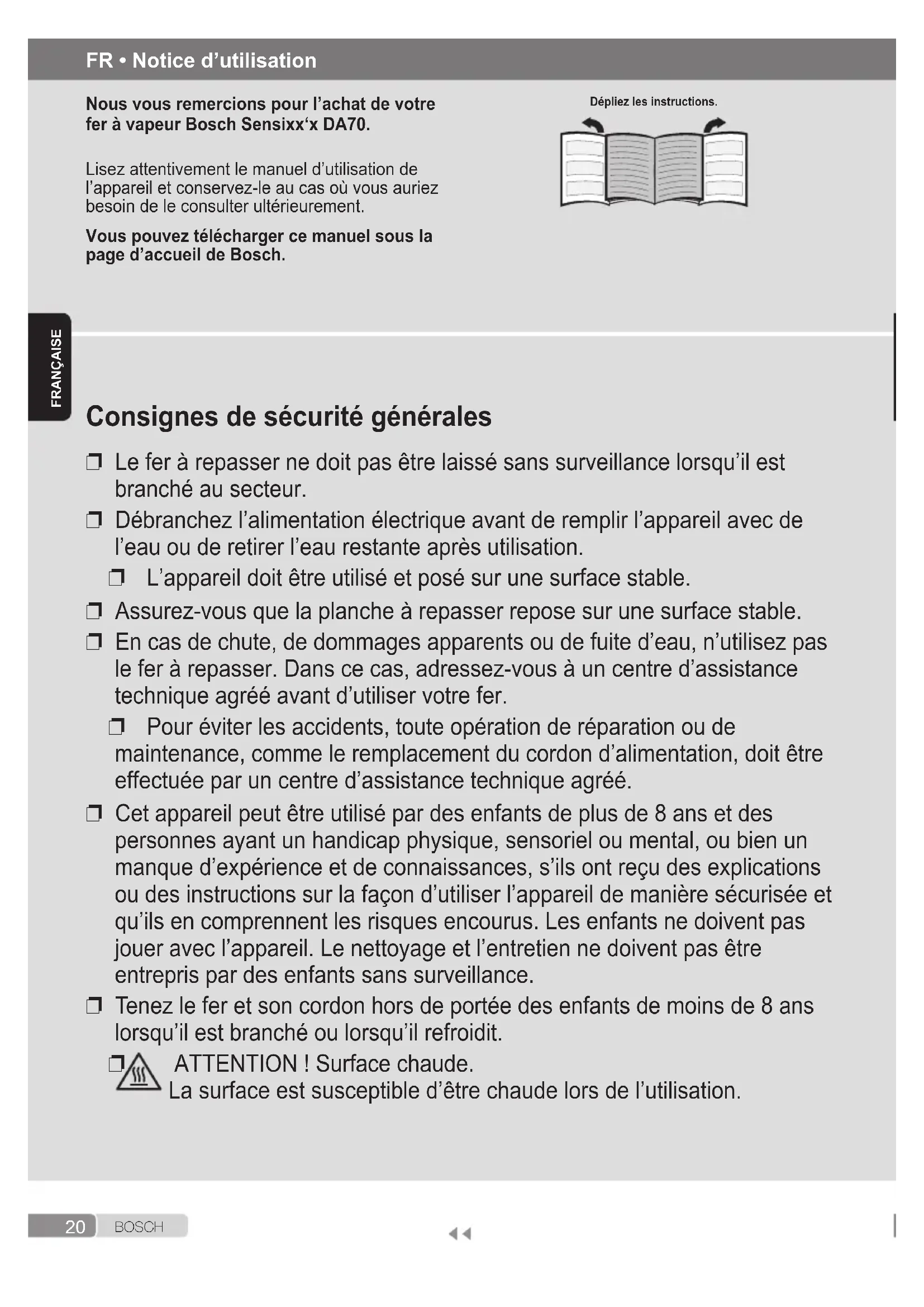 ATTENTION ! Surface chaude. La surface est susceptible d’être chaude lors de l’utilisation. FR • Notice d’utilisation Nous vous remercions pour l’achat de votre fer à vapeur Bosch Sensixx‘x DA70. Lisez attentivement le manuel d’utilisation de l’appareil et conservez-le au cas où vous auriez besoin de le consulter ultérieurement. Vous pouvez télécharger ce manuel sous la page d’accueil de Bosch. Dépliez les instructions.21 B O S C H