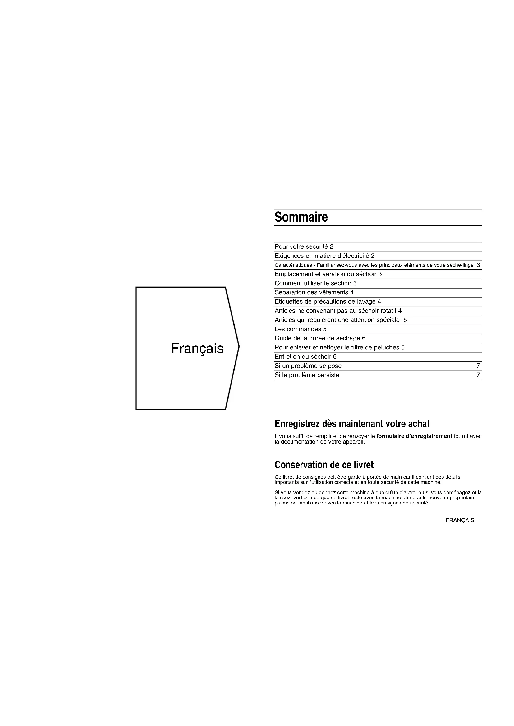 Questo elettrodomestico è conforme alle seguenti direttive CEE. Apparecchi a bassa tensione 2006/95/CEE Compatibilità elettromagnetica 89/336/CEE 92/31/CEE 93/68/CEEFrançais FRANÇAIS 1 Pour votre sécurité 2 Exigences en matière d’électricité 2 Caractéristiques - Familiarisez-vous avec les principaux éléments de votre sèche-linge