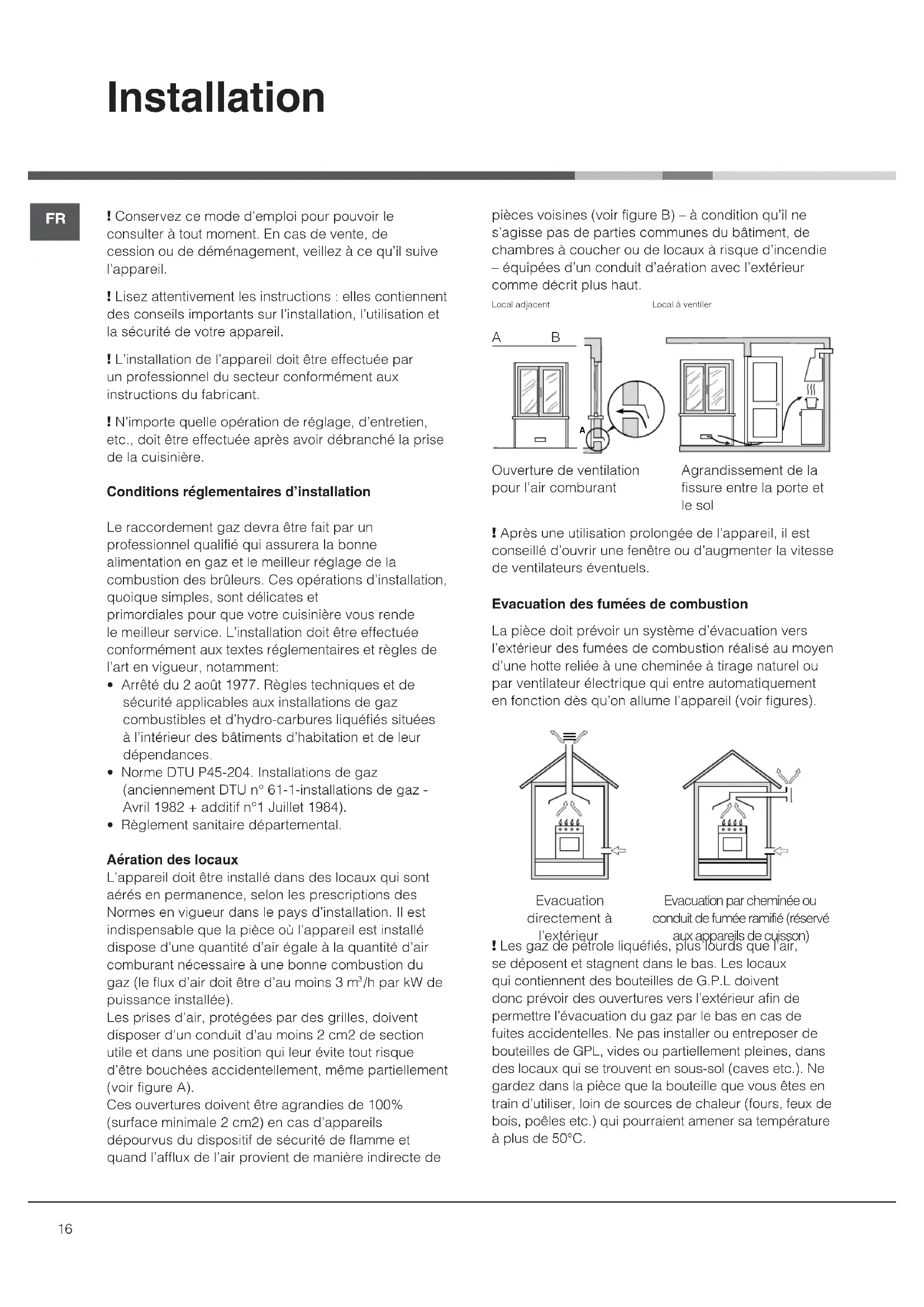 /h par kW de puissance installée). Les prises d’air, protégées par des grilles, doivent disposer d’un conduit d’au moins 2 cm2 de section utile et dans une position qui leur évite tout risque d’être bouchées accidentellement, même partiellement (voir figure A). Ces ouvertures doivent être agrandies de 100% (surface minimale 2 cm2) en cas d’appareils dépourvus du dispositif de sécurité de flamme et quand l’afflux de l’air provient de manière indirecte de pièces voisines (voir figure B) – à condition qu’il ne s’agisse pas de parties communes du bâtiment, de chambres à coucher ou de locaux à risque d’incendie – équipées d’un conduit d’aération avec l’extérieur comme décrit plus haut. A B ! Après une utilisation prolongée de l’appareil, il est conseillé d’ouvrir une fenêtre ou d’augmenter la vitesse de ventilateurs éventuels. Evacuation des fumées de combustion La pièce doit prévoir un système d’évacuation vers l’extérieur des fumées de combustion réalisé au moyen d’une hotte reliée à une cheminée à tirage naturel ou par ventilateur électrique qui entre automatiquement en fonction dès qu’on allume l’appareil (voir figures). ! Les gaz de pétrole liquéfiés, plus lourds que l’air, se déposent et stagnent dans le bas. Les locaux qui contiennent des bouteilles de G.P.L doivent donc prévoir des ouvertures vers l’extérieur afin de permettre l’évacuation du gaz par le bas en cas de fuites accidentelles. Ne pas installer ou entreposer de bouteilles de GPL, vides ou partiellement pleines, dans des locaux qui se trouvent en sous-sol (caves etc.). Ne gardez dans la pièce que la bouteille que vous êtes en train d’utiliser, loin de sources de chaleur (fours, feux de bois, poêles etc.) qui pourraient amener sa température à plus de 50°C.