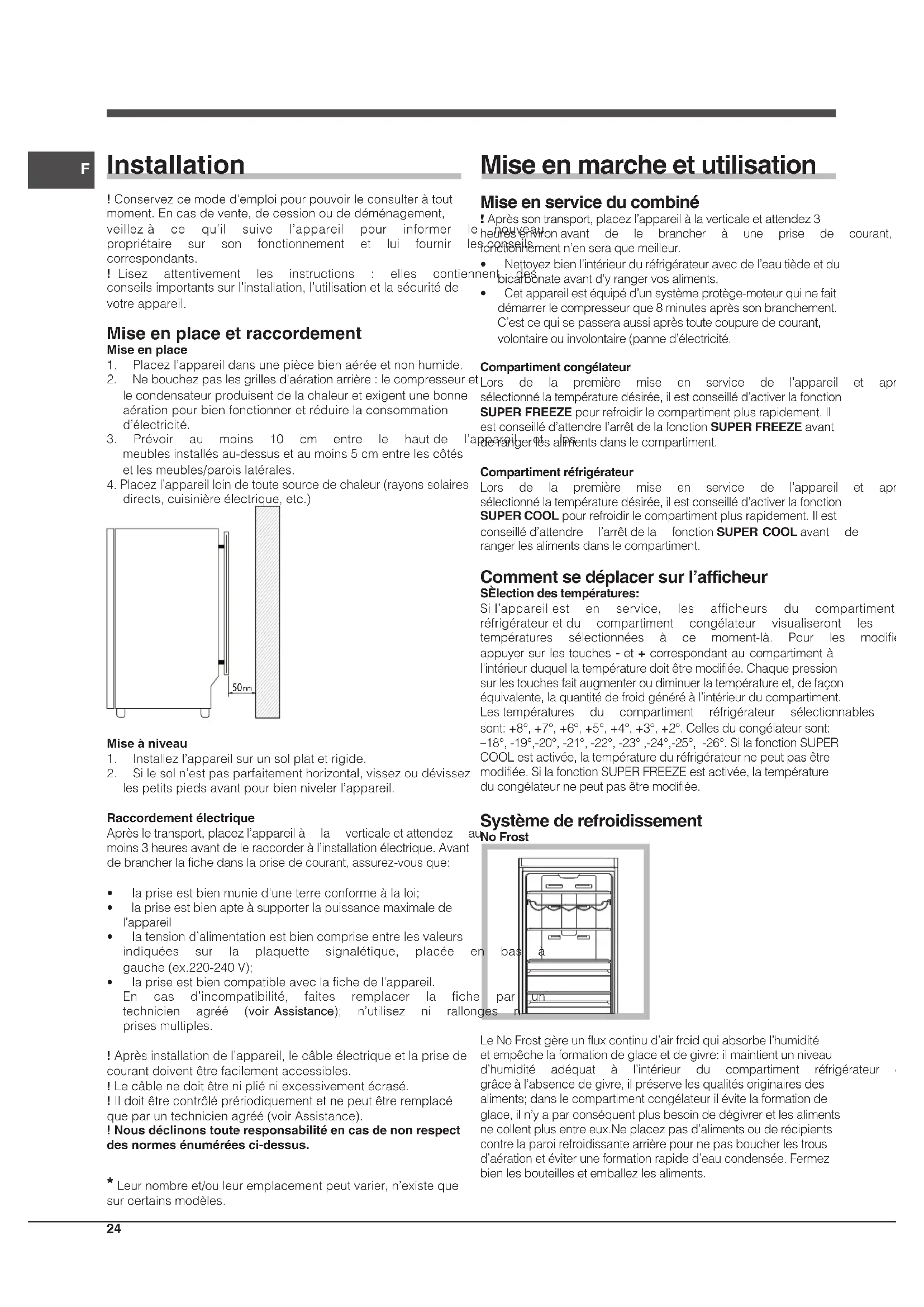 - Cetappareilestéquipéd’unsystèmeprotège-moteurquinefait démarrerlecompresseurque8minutesaprèssonbranchement. C’estcequisepasseraaussiaprèstoutecoupuredecourant, volontaireouinvolontaire(panned’électricité. Compartiment congélateur Lors de la première mise en service de l’appareil et après avoir sélectionnélatempératuredésirée,ilestconseilléd’activerlafonction SUPER FREEZEpourrefroidirlecompartimentplusrapidement.Il estconseilléd’attendrel’arrêtdelafonctionSUPER FREEZEavant derangerlesalimentsdanslecompartiment. Compartiment réfrigérateur Lors de la première mise en service de l’appareil et après avoir sélectionnélatempératuredésirée,ilestconseilléd’activerlafonction SUPER COOLpourrefroidirlecompartimentplusrapidement.Ilest conseilléd’attendre l’arrêtdela fonctionSUPER COOLavant de rangerlesalimentsdanslecompartiment. Comment se déplacer sur l’afficheur SÈlection des températures: Sil’appareilest en service, les afficheurs du compartiment réfrigérateuretdu compartiment congélateur visualiseront les températures sélectionnées à ce moment-là. Pour les modifier, appuyersurlestouches-et +correspondantaucompartimentà l’intérieurduquellatempératuredoitêtremodifiée.Chaquepression surlestouchesfaitaugmenteroudiminuerlatempératureet,defaçon équivalente,laquantitédefroidgénéréàl’intérieurducompartiment. Lestempératures du compartiment réfrigérateur sélectionnables sont:+8°,+7°,+6°,+5°,+4°,+3°,+2°.Cellesducongélateursont: –18°,-19°,-20°,-21°,-22°,-23°,-24°,-25°,-26°.SilafonctionSUPER COOLestactivée,latempératureduréfrigérateurnepeutpasêtre modifiée.SilafonctionSUPERFREEZEestactivée,latempérature ducongélateurnepeutpasêtremodifiée. Système de refroidissement No Frost LeNoFrostgèreunfluxcontinud’airfroidquiabsorbel’humidité etempêchelaformationdeglaceetdegivre:ilmaintientunniveau d’humidité adéquat à l’intérieur du compartiment réfrigérateur et, grâceàl’absencedegivre,ilpréservelesqualitésoriginairesdes aliments;danslecompartimentcongélateurilévitelaformationde glace,iln’yaparconséquentplusbesoindedégivreretlesaliments necollentplusentreeux.Neplacezpasd’alimentsouderécipients contrelaparoirefroidissantearrièrepournepasboucherlestrous d’aérationetéviteruneformationrapided’eaucondensée.Fermez bienlesbouteillesetemballezlesaliments. *Leurnombreet/ouleuremplacementpeutvarier,n’existeque surcertainsmodèles.F