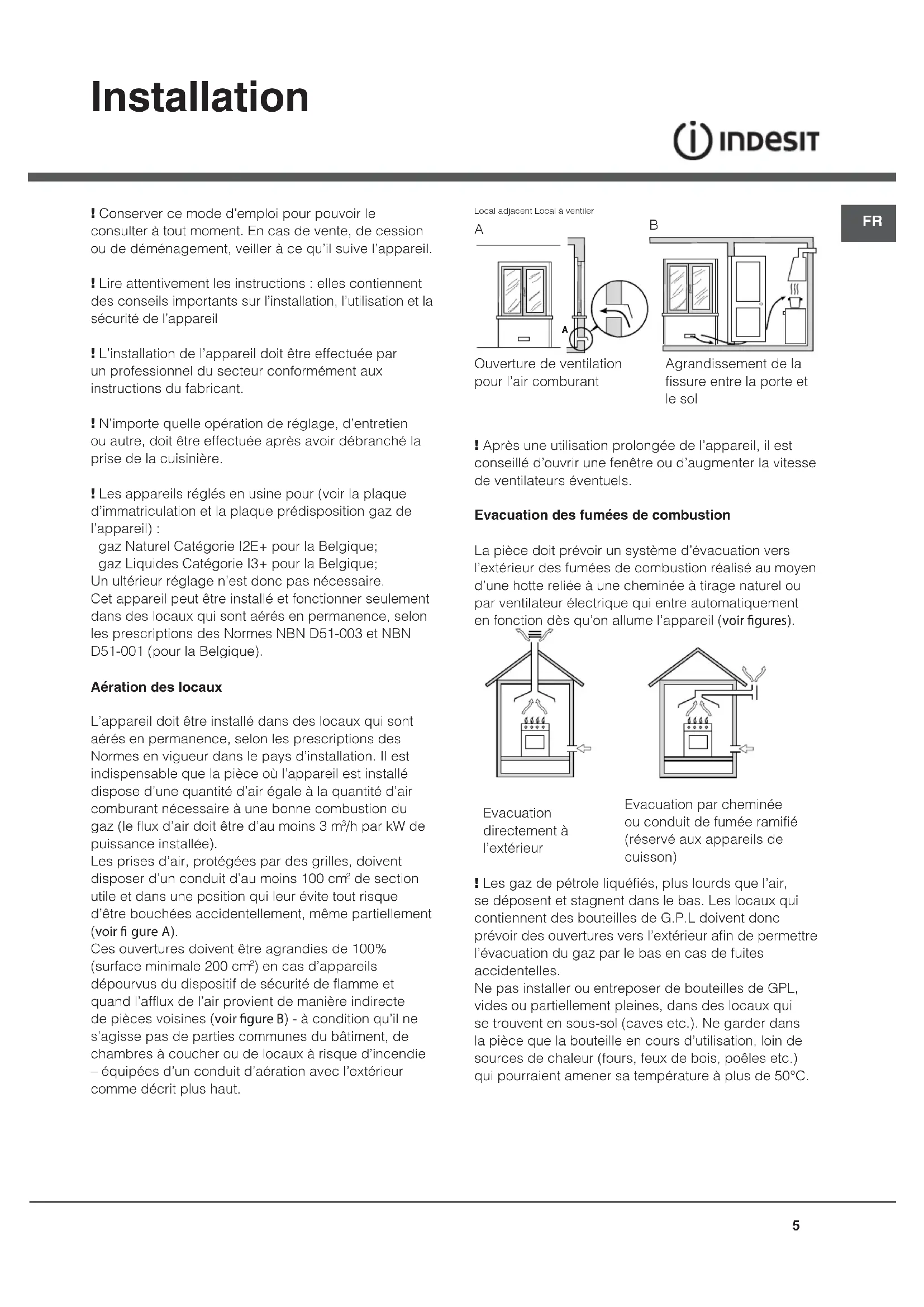 ! Conserver ce mode d’emploi pour pouvoir le consulter à tout moment. En cas de vente, de cession ou de déménagement, veiller à ce qu’il suive l’appareil. ! Lire attentivement les instructions : elles contiennent des conseils importants sur l’installation, l’utilisation et la sécurité de l’appareil ! L’installation de l’appareil doit être effectuée par un professionnel du secteur conformément aux instructions du fabricant. ! N’importe quelle opération de réglage, d’entretien ou autre, doit être effectuée après avoir débranché la prise de la cuisinière. ! Les appareils réglés en usine pour (voir la plaque d’immatriculation et la plaque prédisposition gaz de l’appareil) : gaz Naturel Catégorie I2E+ pour la Belgique; gaz Liquides Catégorie I3+ pour la Belgique; Un ultérieur réglage n’est donc pas nécessaire. Cet appareil peut être installé et fonctionner seulement dans des locaux qui sont aérés en permanence, selon les prescriptions des Normes NBN D51-003 et NBN D51-001 (pour la Belgique). Aération des locaux L’appareil doit être installé dans des locaux qui sont aérés en permanence, selon les prescriptions des Normes en vigueur dans le pays d’installation. Il est indispensable que la pièce où l’appareil est installé dispose d’une quantité d’air égale à la quantité d’air comburant nécessaire à une bonne combustion du gaz (le flux d’air doit être d’au moins 3 m