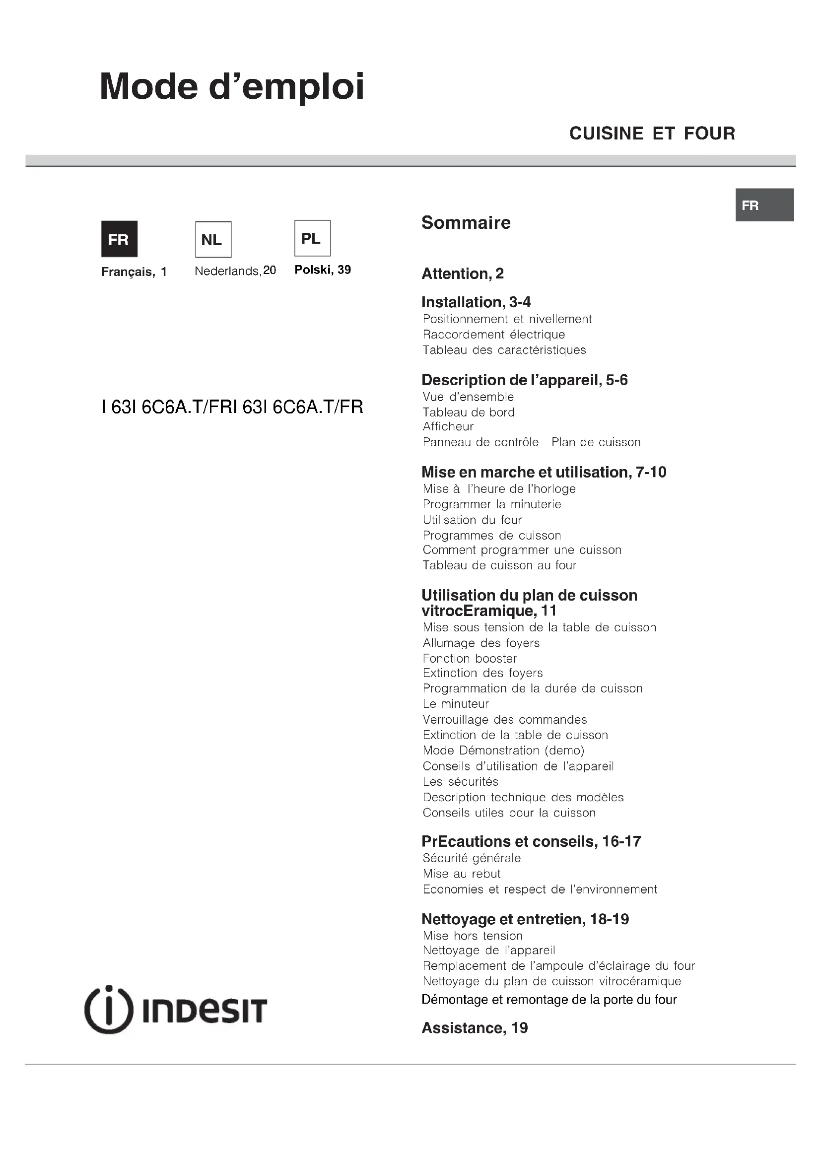 Retrouvez gratuitement la notice de l'appareil I63I 6C6A.T(X)FR INDESIT au format PDF.