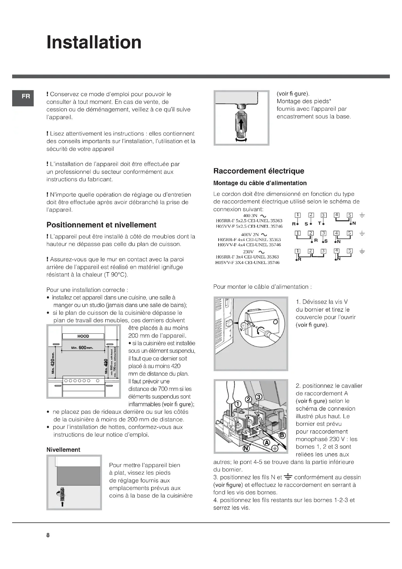 - pour l’installation de hottes, conformez-vous aux instructions de leur notice d’emploi. Nivellement Pour mettre l’appareil bien à plat, vissez les pieds de réglage fournis aux emplacements prévus aux coins à la base de la cuisinière (voir gure). Montage des pieds* fournis avec l’appareil par encastrement sous la base. Raccordement électrique Montage du câble d’alimentation Le cordon doit être dimensionné en fonction du type de raccordement électrique utilisé selon le schéma de connexion suivant: