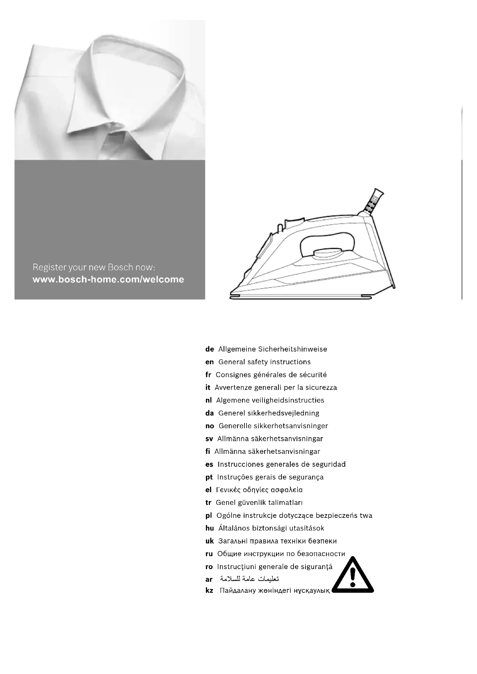 - Do not leave the appliance exposed to weather conditions (rain, sun, frost, etc.). Advice on disposal Our goods come in optimised packaging. This basically consists in using non- contaminating materials which should be handed over to the local waste disposal service as secondary raw materials. Your local town council can give you information about how to dispose of obsolete appliances. This appliance is labelled in accordance with European Directive 2012/19/ EU concerning used electrical and electronic appliances (waste electrical and electronic equipment – WEEE). The guideline determines the framework for the return and recycling of used appliances as applicable throughout the EU.8 FRANÇAISE Lisez attentivement le manuel d’utilisation de l’appareil et conservez-le au cas où vous auriez besoin de le consulter ultérieurement. Vous pouvez télécharger ce manuel sous la page d’accueil de Bosch. Consignes générales de sécurité ■ Ne pas laisser le fer à repasser sans surveillance quand il est branché au courant électrique. ■ Débranchez la prise de la che avant de remplir l’appareil d’eau ou avant de verser le reste d’eau après utilisation. ■ L’appareil doit être utilisé sur une surface stable. ■ Quand il sera placé sur le support,veillez à le poser sur une surface stable. ■ Ne pas utiliser le fer à repasser s’il est tombé, s’il présente de signes visibles de détérioration ou en cas de fuite d’eau. Dans les situations précitées, conez l’appareil pour révision à un Service d’Assistance Technique Agréé avant de l’utiliser à nouveau. ■ An d’éviter les situations dangereuses, toute maintenance ou réparation nécessaire de l’appareil, par ex. le remplacement d’un câble secteur défectueux, doit uniquement être effectuée par le personnel qualié d’un centre d’assistance technique agréé. ■ Cet appareil peut être utilisé par des enfants de plus de 8 ans et des personnes ayant un handicap physique, sensoriel ou mental, ou bien un manque d’expérience et de connaissances, s’ils ont reçu des explications ou des instructions sur la façon d’utiliser l’appareil de manière sécurisée et qu’ils en comprennent les risques encourus. Les enfants ne doivent pas jouer avec l’appareil. Le nettoyage et l’entretien ne doivent pas être entrepris par des enfants sans surveillance. ■ Tenir le fer et son cordon hors de portée des enfants de moins de 8 ans lorsqu’il est branché ou lorsqu’il refroidit. ■ Cet appareil est uniquement destiné à une utilisation domestique à une altitude ne dépassant pas 2000 m. ■ ATTENTION ! Surface chaude. La surface est susceptible d’être chaude lors de l’utilisation.9 Remarques importantes