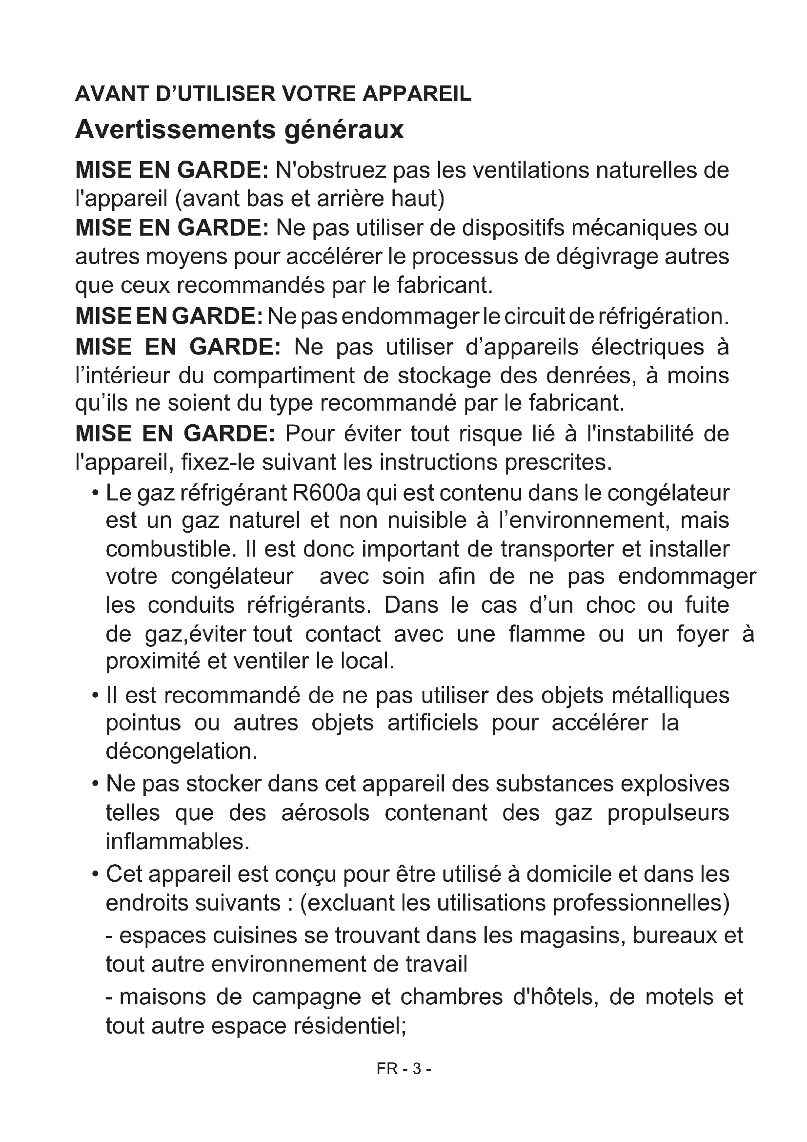 Avertissements généraux MISE EN GARDE: N'obstruez pas les ventilations naturelles de l'appareil (avant bas et arrière haut) MISE EN GARDE: Ne pas utiliser de dispositifs mécaniques ou autres moyens pour accélérer le processus de dégivrage autres que ceux recommandés par le fabricant. MISE EN GARDE: Ne pas endommager le circuit de réfrigération. MISE EN GARDE: Ne pas utiliser d’appareils électriques à l’intérieur du compartiment de stockage des denrées, à moins qu’ils ne soient du type recommandé par le fabricant. MISE EN GARDE: Pour éviter tout risque lié à l'instabilité de l'appareil, xez-le suivant les instructions prescrites.