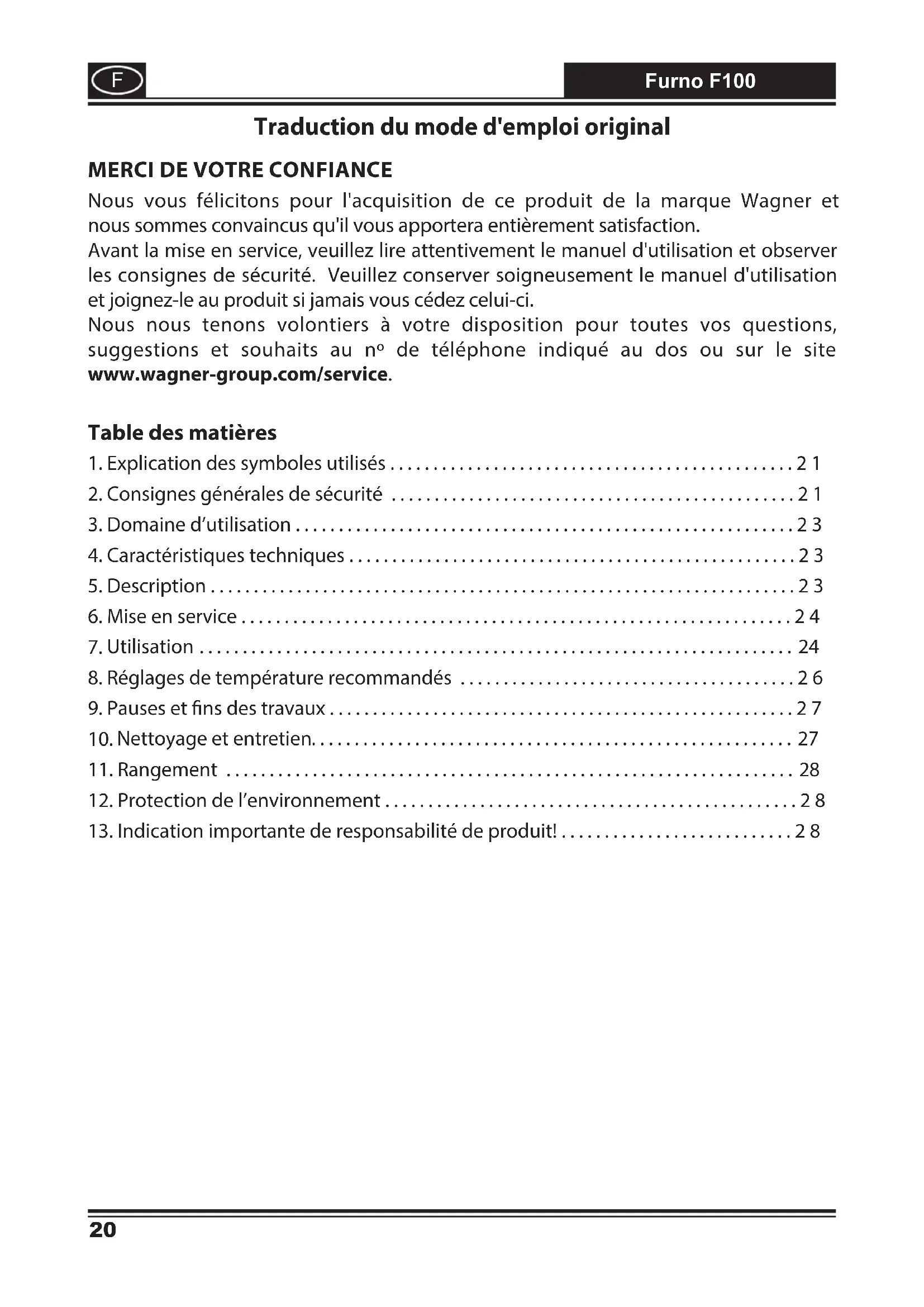 Nous vous félicitons pour l'acquisition de ce produit de la marque Wagner et nous sommes convaincus qu'il vous apportera entièrement satisfaction. Avant la mise en service, veuillez lire attentivement le manuel d'utilisation et observer les consignes de sécurité. Veuillez conserver soigneusement le manuel d'utilisation et joignez-le au produit si jamais vous cédez celui-ci. Nous nous tenons volontiers à votre disposition pour toutes vos questions, suggestions et souhaits au nº de téléphone indiqué au dos ou sur le site www.wagner-group.com/service.F