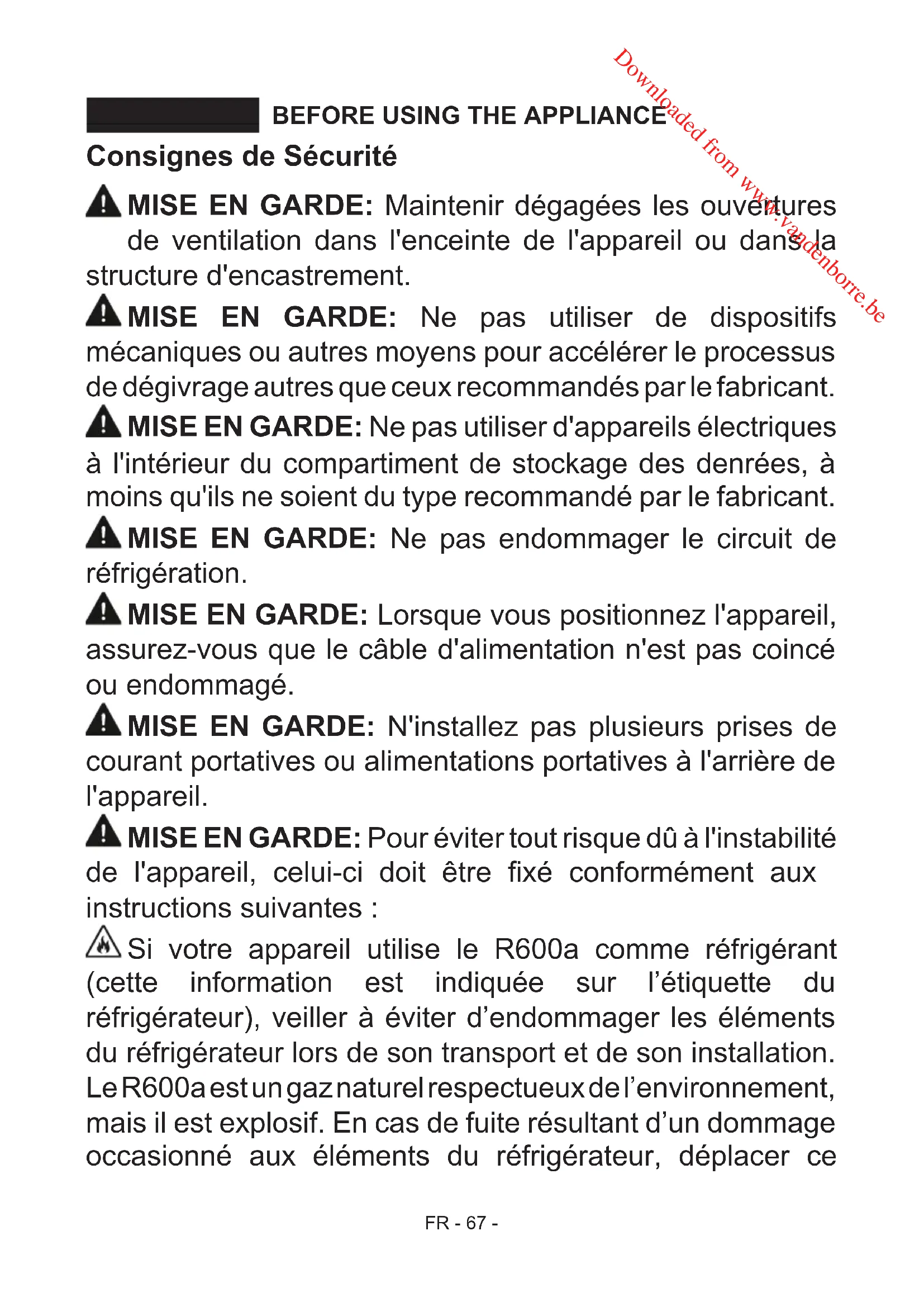 - LES PARTIES DE L’APPAREIL ET LES COMPARTIMENTS Downloaded from www.vandenborre.beFR - 67 - BEFORE USING THE APPLIANCE SECTION - 1. Consignes de Sécurité MISE EN GARDE: Maintenir dégagées les ouvertures de ventilation dans l'enceinte de l'appareil ou dans la structure d'encastrement. MISE EN GARDE: Ne pas utiliser de dispositifs mécaniques ou autres moyens pour accélérer le processus de dégivrage autres que ceux recommandés par le fabricant. MISE EN GARDE: Ne pas utiliser d'appareils électriques à l'intérieur du compartiment de stockage des denrées, à moins qu'ils ne soient du type recommandé par le fabricant. MISE EN GARDE: Ne pas endommager le circuit de réfrigération. MISE EN GARDE: Lorsque vous positionnez l'appareil, assurez-vous que le câble d'alimentation n'est pas coincé ou endommagé. MISE EN GARDE: N'installez pas plusieurs prises de courant portatives ou alimentations portatives à l'arrière de l'appareil. MISE EN GARDE: Pour éviter tout risque dû à l'instabilité de l'appareil, celui-ci doit être xé conformément aux instructions suivantes : Si votre appareil utilise le R600a comme réfrigérant (cette information est indiquée sur l’étiquette du réfrigérateur), veiller à éviter d’endommager les éléments du réfrigérateur lors de son transport et de son installation. Le R600a est un gaz naturel respectueux de l’environnement, mais il est explosif. En cas de fuite résultant d’un dommage occasionné aux éléments du réfrigérateur, déplacer ce Downloaded from www.vandenborre.beFR - 68 - dernier an de l’éloigner de toute amme nue ou source de chaleur et aérer la pièce où se trouve l’appareil pendant quelques minutes. p. 87