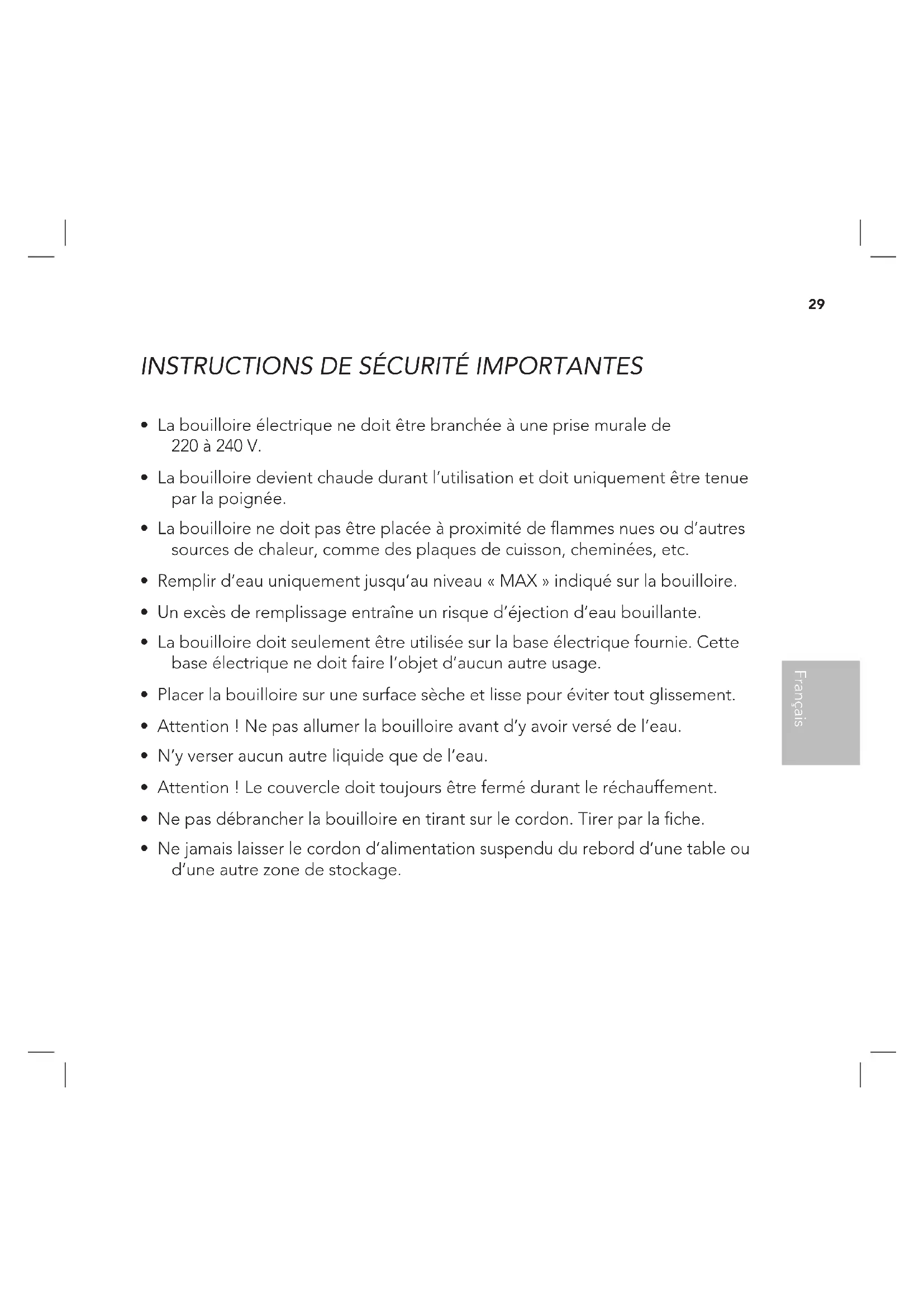 - La bouilloire doit seulement être utilisée sur la base électrique fournie. Cette base électrique ne doit faire l’objet d’aucun autre usage.
