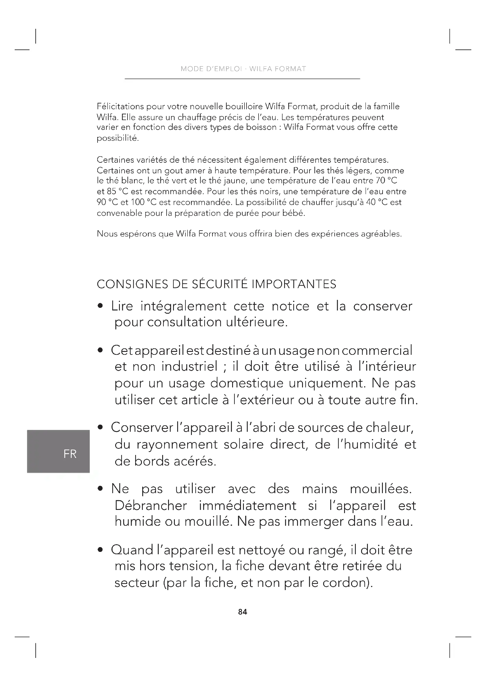 Félicitations pour votre nouvelle bouilloire Wilfa Format, produit de la famille Wilfa. Elle assure un chauffage précis de l’eau. Les températures peuvent varier en fonction des divers types de boisson : Wilfa Format vous offre cette possibilité. Certaines variétés de thé nécessitent également différentes températures. Certaines ont un gout amer à haute température. Pour les thés légers, comme le thé blanc, le thé vert et le thé jaune, une température de l’eau entre 70 °C et 85 °C est recommandée. Pour les thés noirs, une température de l’eau entre 90 °C et 100 °C est recommandée. La possibilité de chauffer jusqu’à 40 °C est convenable pour la préparation de purée pour bébé. Nous espérons que Wilfa Format vous offrira bien des expériences agréables.
