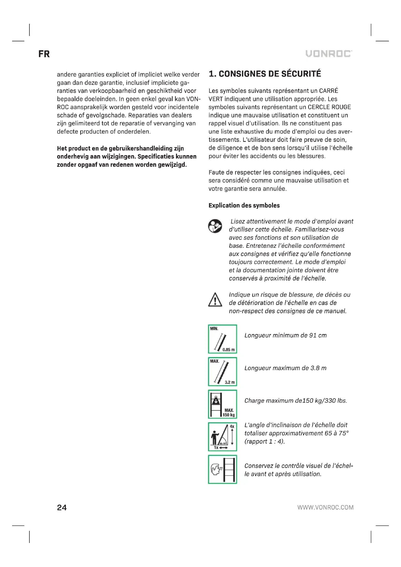ettoyage Nettoyer régulièrement l’appareil, de préférence après chaque utilisation. Nettoyez avec un produit d’entretien ménager adapté et un chiffon doux et sec. N’immergez pas l’échelle dans l’eau ou dans un liquide quelconque pour quelque raison que ce soit.N’utilisez pas de solvant (essence, alcool, ammoniaque, etc.) car ces substances peuvent endommager les pièces en plastique. Stockage Stockez votre échelle à l’intérieur, dans un lieu sec et à l’écart des contaminants. Ne faites pas reposer d’autres objets sur l’échelle. Ne stockez l’échelle qu’une fois sèche. N’exposez pas votre système d’échelle à des en- vironnements humides ou mouillés qui l’endom- magent. Stockez-la dans le bon sens. La base doit toujours reposer au sol. Stockez-la hors de portée des enfants. Entretien N’utilisez jamais une échelle télescopique endom- magée ou cassée. Les réparations temporaires sont interdites. Vérifiez les pieds en plastique de l’échelle avant et après utilisation. N’utilisez pas l’échelle sans les pieds en plastique ou lorsque ces derniers sont usés. L’échelle est équipée de couvercles en plastique en haut afin d’empêcher la poussière et les contaminants d’y pénétrer. N’utilisez pas l’échelle sans les couvercles en plastique. Conservez toujours le contrôle visuel de l’échelle avant et après utilisation. Les réparations et l’entretien doivent être ef- fectués par une personne compétente avec les pièces de rechange adaptées. Les pièces tierces non approuvées sont déconseillées et annulent votre garantie. GARANTIE Les produits VONROC sont développés aux plus hau- ts standards de qualité et ils sont garantis contre les défauts de pièces et de main d’oeuvre pendant la durée légale stipulée à partir de la date d’achat d’o- rigine du produit. En cas d’une quelconque panne du produit pendant cette durée qui serait due à un défaut matériel et/ou de main d’oeuvre, contactez directement VONROC. Les circonstances suivantes ne sont pas prises en charge par la garantie:
