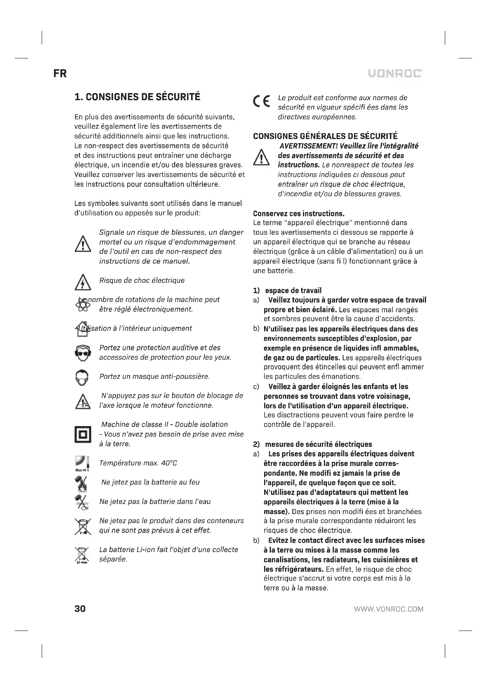 Assurez-vous d’éteindre la machine avant de procéder à des opérations de mainte- nance sur le système mécanique. Nettoyez régulièrement le carter au moyen d’un chiffon doux, de préférence à l’issue de chaque uti- lisation. Veillez à ce que les fentes d’aération soient indemnes de poussière et de saletés. En pré- sence de saleté tenace, employez un chiffon doux humecté d’eau savonneuse. Proscrivez l’emploi de solvants comme l’essence, l’alcool, l’ammoniaque etc. car ces substances attaquent les pièces en plastique. ENVIRONNEMENT Tout équipement électronique ou électrique défectueux dont vous souhaitez vous débarrasser doit être déposé dans un centre de collecte adapté. Uniquement pour les pays CE Ne jetez pas les outils électriques avec les déchets domestiques. Selon la directive européenne 2012/19/EU « Déchets d’équipements électriques et électroniques » et sa mise en oeuvre dans le droit national, les outils électriques hors d’usage doivent être collectés séparément et mis au rebut de manière écologique. GARANTIE Les produits VONROC sont développés aux plus hauts standards de qualité et ils sont garantis contre les défauts de pièces et de main d’oeuvre pendant la durée légale stipulée à partir de la date d’achat d’origine du produit. En cas d’une quelconque panne du produit pendant cette durée qui serait due à un défaut matériel et/ou de main d’oeuvre, contac- tez directement VONROC. Les circonstances suivantes ne sont pas prises en charge par la garantie: