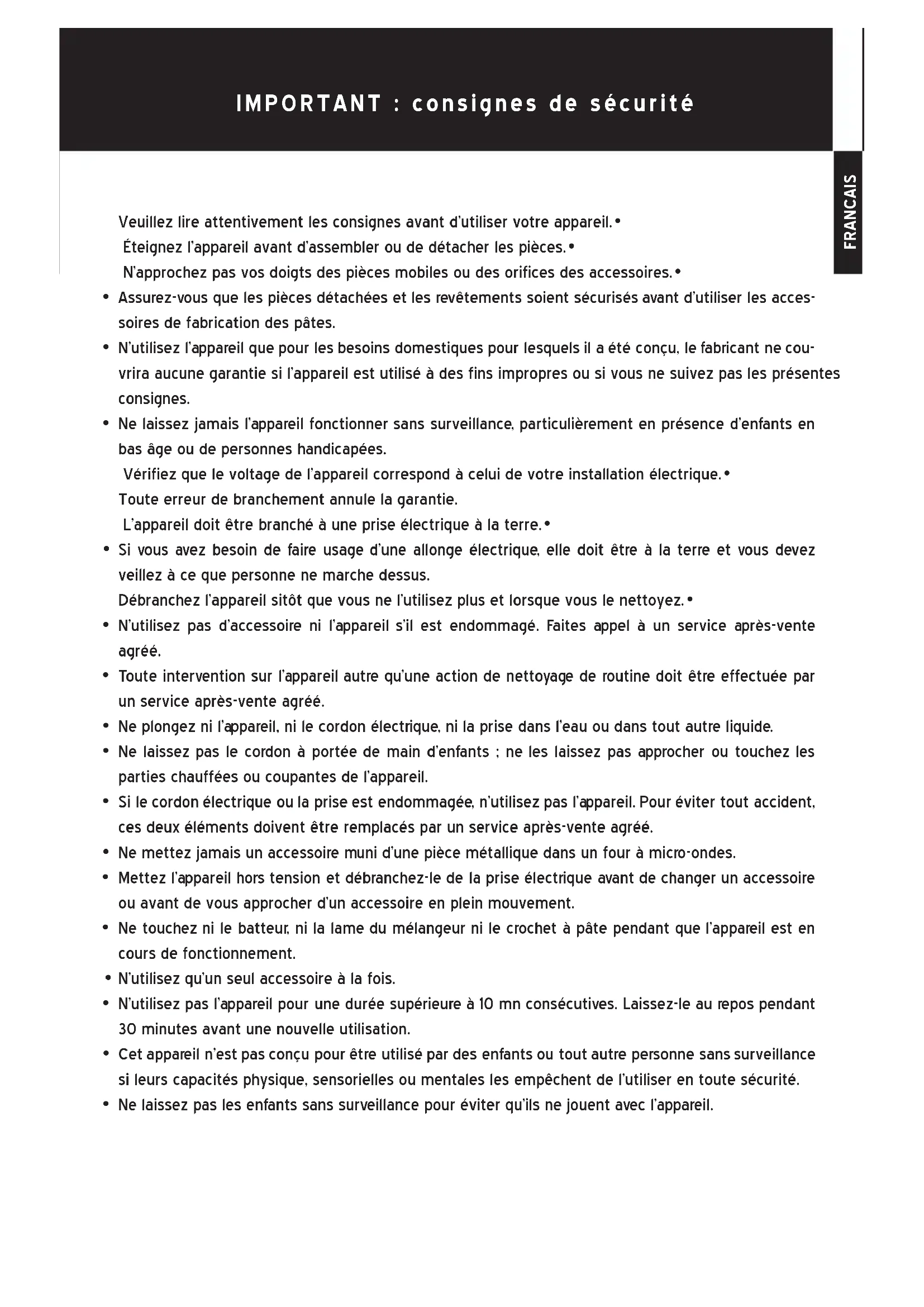 9Risque de blessure Débranchez le batteur avant de toucher les fouets. Ne pas suivre ces consignes peut se traduire par des os brisés, des coupures ou des ecchymoses. REMARQUE : Ne grattez pas le bol pendant que le batteur sur socle fonctionne. Le bol et le fouet sont conçus pour assurer une homogénéité du mélange sans raclage fréquent. En général, il suffit de racler le bol une ou deux fois durant le mélange. Arrêtez l’appareil pour le raclage. Le batteur sur socle peut s’échauffer lorsqu’il fonctionne. Dans le cas de charges importantes et d’une durée de mélange prolongée, il est possible que vous ne puissiez pas toucher facilement le dessus de l’appareil. C’est normal. INFORMATIONS TECHNIQUES Tension/fréquence : 220—240V - 50/60Hz (1200W) Contenance du bol : 5.5 litres