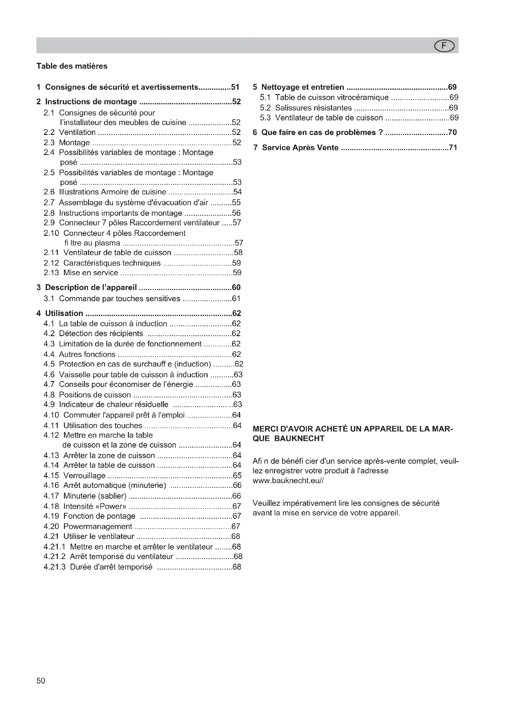 - Table des matières MERCI D'AVOIR ACHETÉ UN APPAREIL DE LA MAR- QUE BAUKNECHT Afi n de bénéfi cier d'un service après-vente complet, veuil- lez enregistrer votre produit à l'adresse www.bauknecht.eu// Veuillez impérativement lire les consignes de sécurité avant la mise en service de votre appareil. 1 Consignes de sécurité et avertissements p. 51