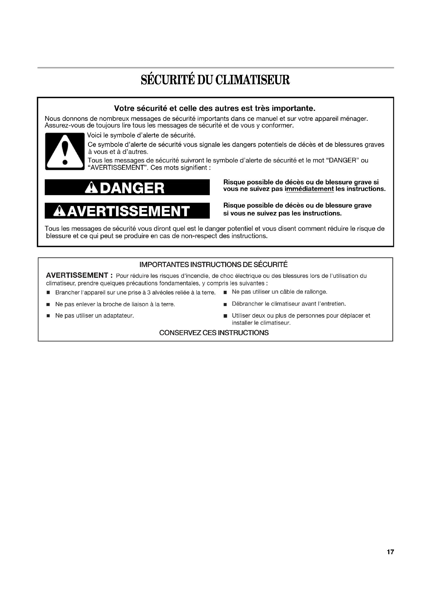Débrancher le climatiseur avant l'entretien.Utiliser deux ou plus de personnes pour déplacer et installer le climatiseur. Brancher l'appareil sur une prise à 3 alvéoles reliée à la terre. Ne pas enlever la broche de liaison à la terre.Ne pas utiliser un adaptateur.Ne pas utiliser un câble de rallonge.18