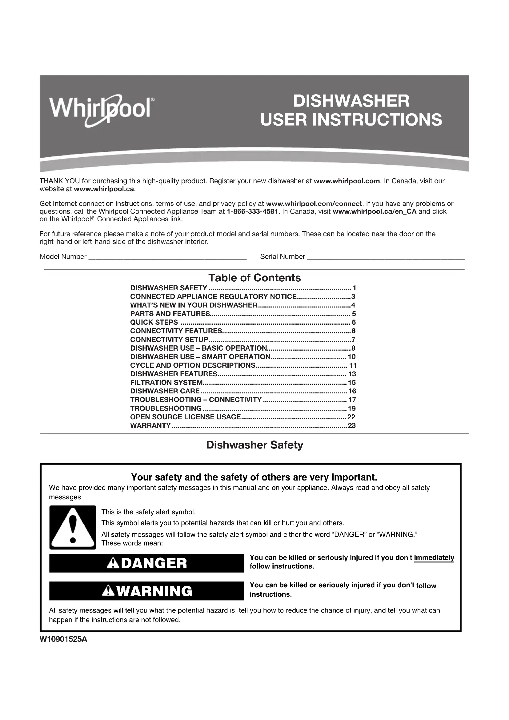 Nous vous REMERCIONS d’avoir acheté ce produit de haute qualité. Enregistrez votre lave-vaisselle sur www.whirlpool.com. Au Canada, visitez notre site web www.whirlpool.ca. Obtenez les instructions de connexion Internet, les conditions d’utilisation et la politique de confidentialité à l’adresse www.whirlpool.com/connect. Si vous avez des problèmes ou des questions, appelez l’équipe de Whirlpool Corporation Connected Appliances au 1 866 333-4591. Au Canada, visitez notre site web www.whirlpool.ca/fr_CA et cliquez sur le lien Whirlpool