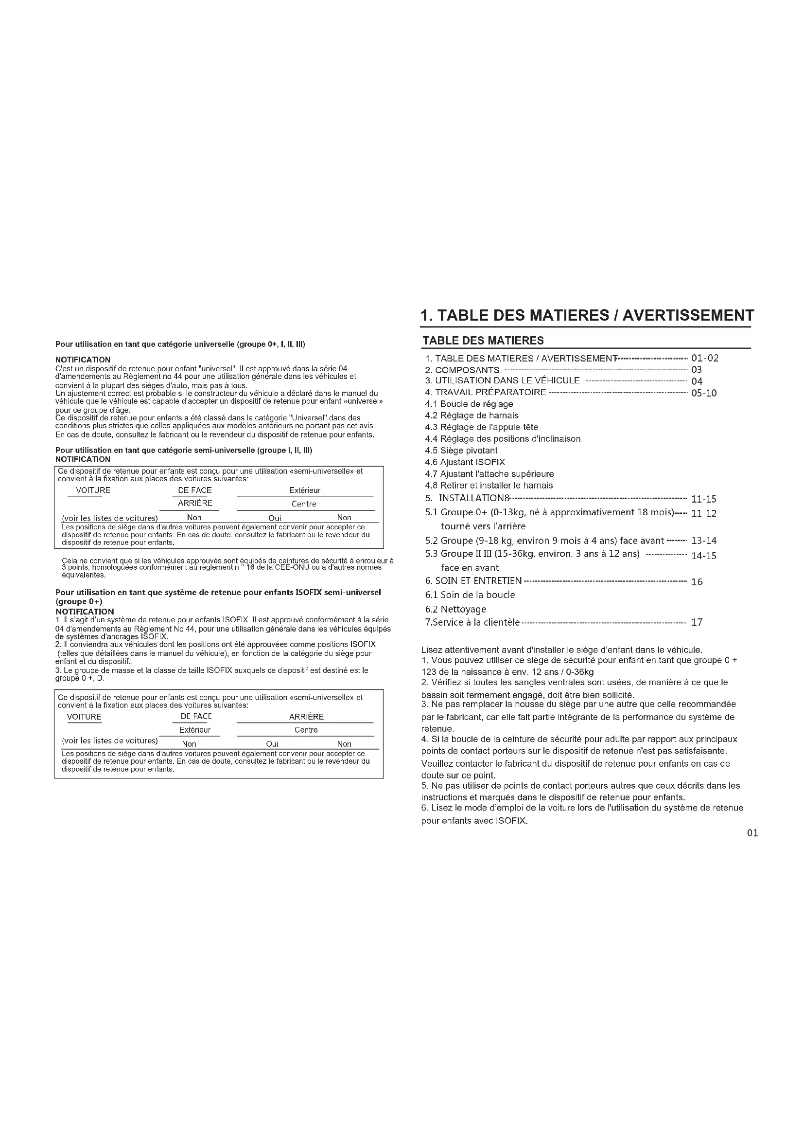 1. TABLE DES MATIERES / AVERTISSEMENT