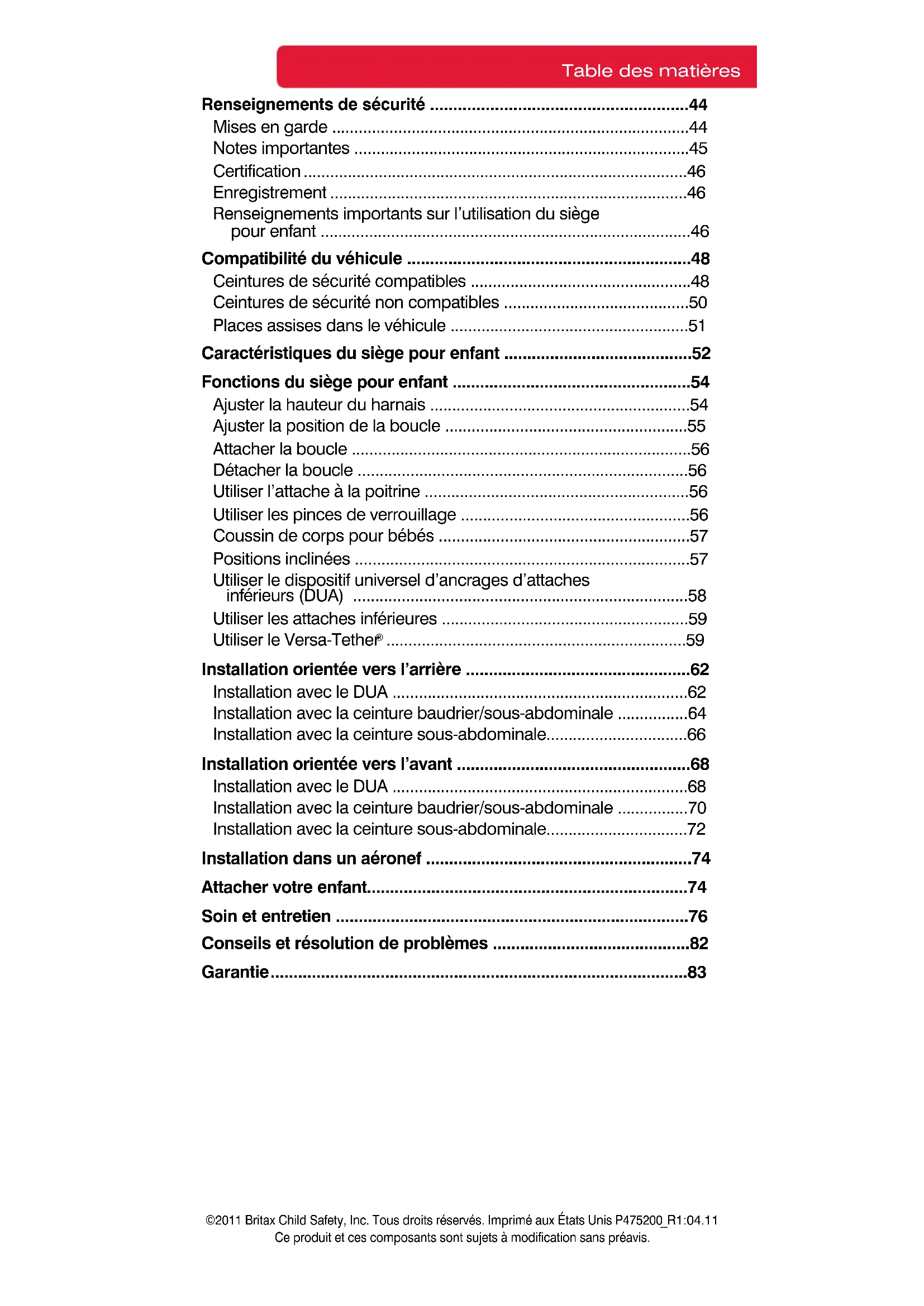 ou dans une autre pièce du siège pour enfant. Dégagez la pièce et réessayez d’ajuster le harnais. Quand le Versa-Tether n’est pas utilisé, rangez-le toujours dans la pochette. Quand le Versa-Tether est utilisé, attachez toujours le surplus de sangle avec la courroie élastique. Voir les pages 59 à 61. Solution possible : Le dossier du siège du véhicule peut entraver la sangle d’ajustement du harnais. Assurez-vous que le siège pour enfant repose bien à plat sur le siège du véhicule. Solution possible : Assurez-vous que le harnais n’est pas ajusté à la hauteur la plus haute ou la plus basse, que le harnais n’est pas trop serré pour être ajusté ou que le poids de l’enfant ne porte pas contre le coussin appui-tête. Corrigez toutes ces situations s’il y a lieu, puis réessayez d’ajuster le harnais. Problème : Les côtés de la sangle d’ajustement s’effilochent. Solution possible : Tirez la sangle réglable du harnais vers le haut et en direction opposée au siège pour enfant pour bien la serrer. Pour éviter que la sangle d’ajustement du harnais ne s’effiloche, ne tirez pas la sangle latéralement. Voir la page 75. Problème : Il n’y a pas de déclic quand patte de la boucle est insérée dans la boucle. Solution possible : Il peut y avoir des débris dans le mécanisme de la boucle. Nettoyez la boucle tel qu’il est décrit à la page 80, puis réessayez d’attacher la boucle. Veuillez communiquer avec le service à la clientèle au 1-888-427-4829 si vous avez un problème qui n’apparaît pas dans la liste ci-dessus.83 Garantie Ce siège pour enfant a été fabriqué par Britax Child Safety, Inc. Britax