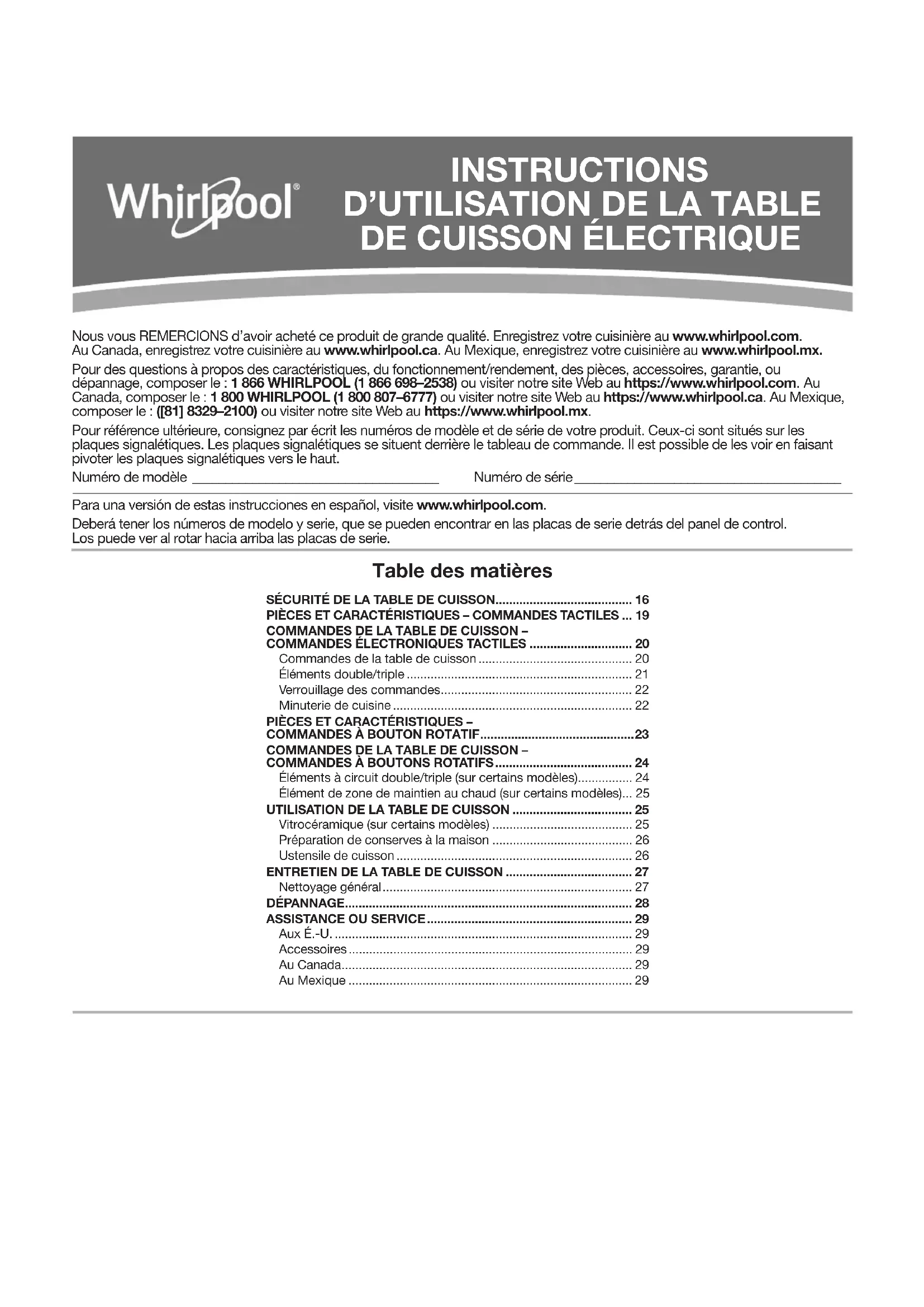 dans votre région, appelez-nous ou contactez le centre de service désigné par Whirlpool le plus proche. Aux É.-U. Téléphoner sans frais au Centre pour l’eXpérience de la clientèle de Whirlpool au: 1866698-2538 ou visitez le www.whirlpool.com. Nos conseillers peuvent vous aider sur les points suivants: ■ Caractéristiques et spécications de notre gamme complète d’appareils ménagers. ■ Renseignements sur l’installation. ■ Procédures d’utilisation et d’entretien. ■ Vente d’accessoires et de pièces de rechange. ■ Assistance spécialisée au client (langue espagnole, malentendants, malvoyants, etc.). ■ Orientation vers des fournisseurs, compagnies de service de réparation et distributeurs de pièces de rechange locaux. Lestechniciens de service désignés par Whirlpool sont formés pour remplir la garantie des produits et fournir un service après garantie partout aux États-Unis. Pour localiser le service d’entretien de votre région désigné par Whirlpool, consultez aussi les Pages jaunes. Pour plus d’assistance Pour obtenir plus d’aide, écrivez à Whirlpool Corporation et soumettez toute question ou tout problème à: Whirlpool Brand Home Appliances Customer eXperience Center 553 Benson Road Benton Harbor, MI 49022-2692 Veuillez indiquer dans votre correspondance un numéro de téléphone où l’on peut vous joindre dans la journée. Accessoires Accessoires aux É.-U. Pour commander des accessoires, visitez le www.whirlpool.com/cookingaccessories Ensemble pour la mise en conserves (modèles avec éléments en spirale) Commander le numéro de pièce242905 Nettoyant pour table de cuisson (modèles en vitrocéramique) Commander le numéro de pièce31464 Protecteur de table de cuisson (modèles en vitrocéramique) Commander le numéro de pièce31463 Ensemble d’entretien de la table de cuisson (comprend le nettoyant, le protecteur, le grattoir et les tampons d’application) Commander le numéro de pièce31605 Grattoir pour table de cuisson (modèles en vitrocéramique) Commander le numéro de pièceWA906B Nettoyant tout-usage pour appareils ménagers Commander le numéro de pièce31682 Au Canada Appelez sans frais le Centre pour l’eXpérience de la clientèle canadienne de Whirlpool au : 1 800 807-6777. Nos conseillers peuvent vous aider sur les points suivants: ■ Caractéristiques et spécications de notre gamme complète d’appareils ménagers. ■ Procédures d’utilisation et d’entretien. ■ Vente d’accessoires et de pièces de rechange. ■ Orientation vers des revendeurs, distributeurs de pièces de rechange et services de réparation locaux. Les techniciens de service désignés par Whirlpool Canada LP sont formés pour remplir la garantie des produits et fournir un service après la garantie, partout au Canada. Pour plus d’assistance Pour obtenir plus d’assistance, écrivez à Whirlpool Canada LP etsoumettez toute question ou tout problème à: Customer eXperience Centre Whirlpool Canada LP 200 – 6750 Century Ave. Mississauga, Ontario L5N 0B7 Veuillez indiquer dans votre correspondance un numéro de téléphone où l’on peut vous joindre dans la journée. Au Mexique Téléphoner au Centre d’eXpérience de la clientèle de Whirlpool Téléphone: (81) 8329-2100. Au sein de la République mexicaine Téléphone : 01 (81) 8329-2100 Ou visiter le www.whirlpool.mx/servicio. Pour plus d’assistance Pour obtenir plus d’aide, écrivez à Whirlpool Properties et soumettez toute question ou tout problème à: Whirlpool México, S. de R.L. de C.V. Antigua Carretera Roma Km 9 S/N Col. El Milagro, Apodaca, N.L., Mexico, C.P. 66634 Veuillez indiquer dans votre correspondance un numéro de téléphone où l’on peut vous joindre dans la journée.LE AGRADECEMOS la compra de este producto de alta calidad. Registre su estufa en www.whirlpool.com. En Canadá, registre su estufa en www.whirlpool.ca. En México, registre su estufa en www.whirlpool.mx Si tiene preguntas respecto a las características, funcionamiento, rendimiento, piezas, accesorios, garantía o servicio técnico en EE.UU., llame al: 1-866-WHIRLPOOL (1–866–698–2538) o bien, visite nuestro sitio web en https://www.whirlpool.com. En Canadá, llame al: 1-800-WHIRLPOOL (1–800–807–6777) o bien, visite nuestro sitio web en https://www.whirlpool.ca. En México, llame al: ([81] 8329–2100) o bien, visite nuestro sitio web en https://www.whirlpool.mx. Para referencia futura, tome nota de los números de modelo y de serie de su producto. Esos datos pueden estar en las placas de identicación. Las placas de identicación se encuentran detrás del panel de control. Para verlo, debe rotar las placas de identicación hacia arriba. Número de modelo _____________________________________ Número de serie ________________________________________ Para una versión en español de estas instrucciones, visite www.whirlpool.com. Deberá tener los números de modelo y serie, que se pueden encontrar en las placas de identicación detrás del panel de control. Para verlos, debe rotar las placas de identicación hacia arriba. Índice INSTRUCCIONES PARA