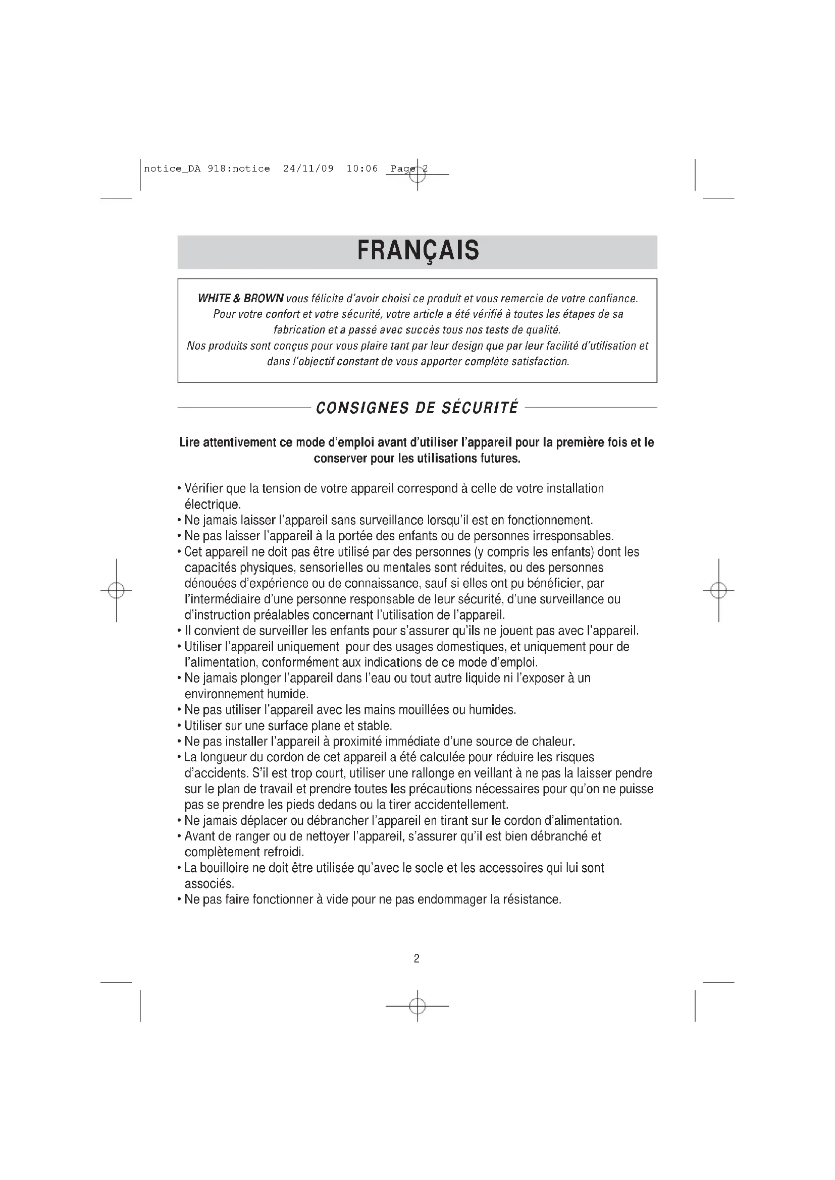 FRANÇAIS FRANÇAIS WHITE & BROWN vous félicite d’avoir choisi ce produit et vous remercie de votre confiance. Pour votre confort et votre sécurité, votre article a été vérifié à toutes les étapes de sa fabrication et a passé avec succès tous nos tests de qualité. Nos produits sont conçus pour vous plaire tant par leur design que par leur facilité d’utilisation et dans l’objectif constant de vous apporter complète satisfaction. notice_DA 918:notice 24/11/09 10:06 Page 2• Vérifier régulièrement l’état du cordon d’alimentation. Ne pas utiliser l’appareil si le cordon d’alimentation, la prise ou l’appareil sont endommagés.