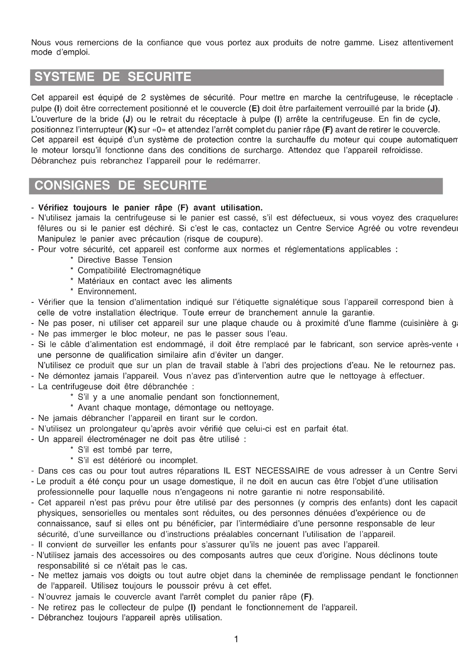 Le produit ne fonctionne pas La prise nʼest pas branchée, lʼinterrupteur nʼest pas sur “1” ou “2”. Branchez lʼappareil sur une prise de même voltage, actionnez lʼinterrupteur. Le réceptacle à pulpe (I) nʼest pas correctement positionné. Vérifiez le bon positionnement du réceptable à pulpe (I). Le couvercle (E) nʼest pas bien verrouillé. Vérifiez le bon positionnement et le bon verrouillage du couvercle (E). Le produit dégage une odeur ou est très chaud au toucher, sʼil émane de la fumée ou fait un bruit anormal. Le panier râpe (F) nʼest pas correctement positionné. Vérifiez le bon positionnement du panier râpe (F). Les quantités dʼaliments traitées sont trop importantes. Laissez refroidir lʼappareil puis diminuez les quantités traitées. Pour tout autre problème ou anomalie, contactez le service après-vente le plus proche. SI VOTRE APPAREIL NE FONCTIONNE PAS, QUE FAIRE ?6 Thank you for choosing an appliance in our product range. Please read these instructions carefully. SAFETY INSTRUCTIONS - Always check the sieve (F) before use. Never use the juice machine if the sieve is broken or damaged or if there is visible cracking or crazing or the sieve is torn. If there is any evident damage to the sieve, contact an Approved Service Centre. Handle the sieve with care (sharp edges). - For your safety, this appliance is compliant with applicable standards and regulations: