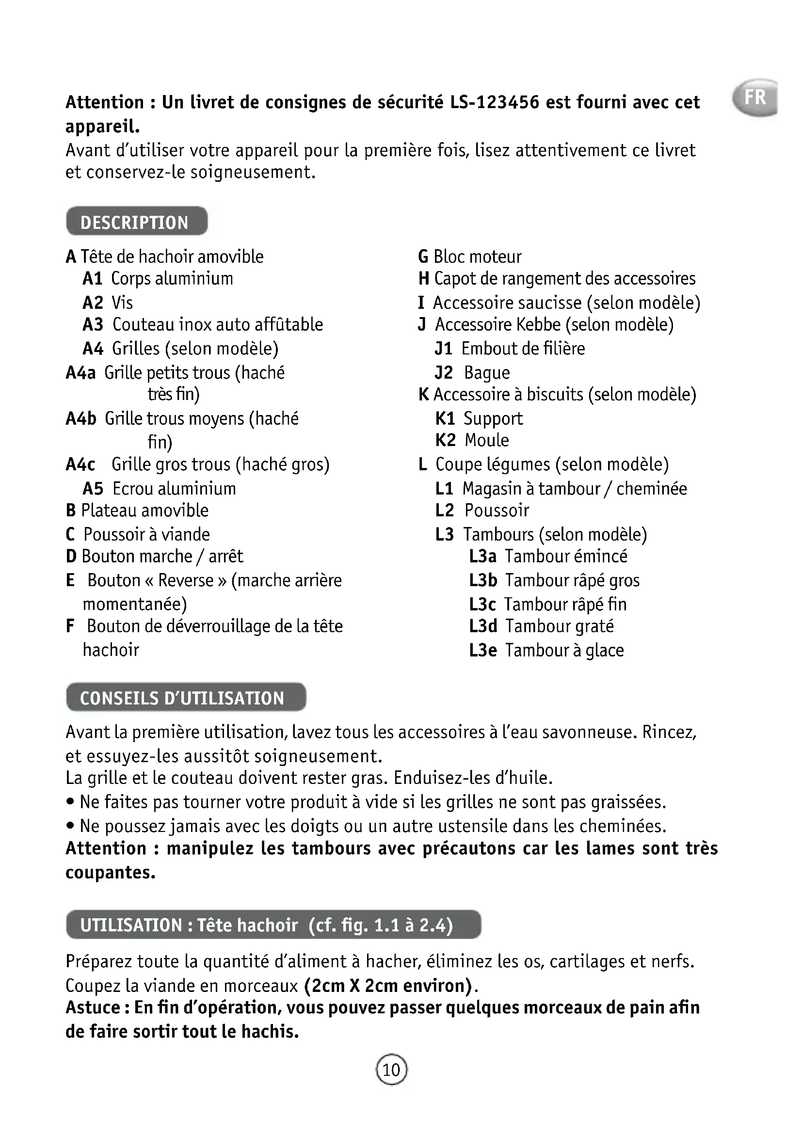 - Appuyez sur la position « I » du bouton marche/arrêt (D) pour continuer le hachage. ACCESSOIRE SAUCISSES (cf. fig. 3.1 à 3.6) Important : cet accessoire n’est à utiliser qu’après avoir haché la viande, avoir rajouté l’assaisonnement et avoir bien brassé la préparation. Après avoir laissé le boyau tremper dans de l’eau tiède pour retrouver son élasticité, enfilez-le sur l’entonnoir en laissant dépasser 5 cm (que vous obturerez en faisant un noeud avec un lien). Mettez en marche l’appareil, alimentez le hachoir en hachis et faire suivre le boyau à mesure que celui-ci se remplit. Nota : ce travail se fera plus facilement à deux, l’un s’occupera d’approvisionner en hachis, l’autre s’occupera du remplissage du boyau. Donner aux saucisses la longueur désirée en pinçant et en tournant le boyau. Pour avoir une saucisse de qualité, prenez soin d’éviter d’emprisonner de l’air lors du remplissage et faites des saucisses de 10 à 15 cm (séparez les saucisses en plaçant un lien et en faisant un noeud à l’aide de celui-ci). ACCESSOIRE KEBBE (cf. fig. 4.1 et 4.3) Conseil pratique : Pour la réalisation de la pâte fine de Kebbe ou Kefta, passer la viande 2 à 3 fois dans la tête de hachoir jusqu’à obtention de la finesse désirée. ACCESSOIRE À BISCUITS (cf. fig. 5.1 à 5.3) Préparez la pâte. Vous obtiendrez de meilleurs résultats avec une pâte un peu molle. Choisissez le dessin en faisant correspondre la flèche et la forme choisie. Approvisionnez jusqu’à ce que vous ayiez obtenu la quantité de biscuits désirée. COUPE LÉGUMES (cf. fig.6.1 à 6.3) Conseils pour obtenir de bons résultats : Les ingrédients que vous utilisez doivent être fermes pour obtenir des résultats satisfaisants et éviter toute accumulation d’aliment dans le magasin. Ne pas utiliser l’appareil pour râper ou trancher des aliments trop durs tels que du sucre ou des morceaux de viande. FR12 NETTOYAGE (cf. fig. 7.1 à 7.4) RANGEMENT DES ACCESSOIRES (cf. fig 8.1 à 8.2) FR13 Note: Safety instruction booklet LS-123456 is supplied with the appliance. Before using your appliance for the first time, read the booklet carefully and keep it in a safe place. DESCRIPTION A Removable mincer head A1 Aluminium casing A2 Screw A3 Self-sharpening stainless steel blade A4 Grilles (depending on model) A4a Small-hole grille (very fine mincing) A4b Medium-hole grille (fine mincing) A4c Large-hole grille (coarse mincing) A5 Aluminium nut B Removable tray C Meat pusher D On/off button E «Reverse» button (short reverse movement) F Mincer head release button G Motor unit H Accessory storage cover I Sausage accessory (depending on model) J Kebbe accessory (depending on model) J1 Die end piece J2 Ring K Biscuit maker accessory (depending on model) K1 Support K2 Mould L Vegetable chopper (depending on model) L1 Drum body/feed tube L2 Pusher L3 Drums (depending on model) L3a Slicing drum L3b Coarse grating drum L3c Fine grating drum L3d Scraper drum L3e Ice shaving drum USE Before using for the first time, wash all the accessories in soapy water. Rinse and dry them carefully. The grille and the blade should be lightly greased. Coat them with oil.