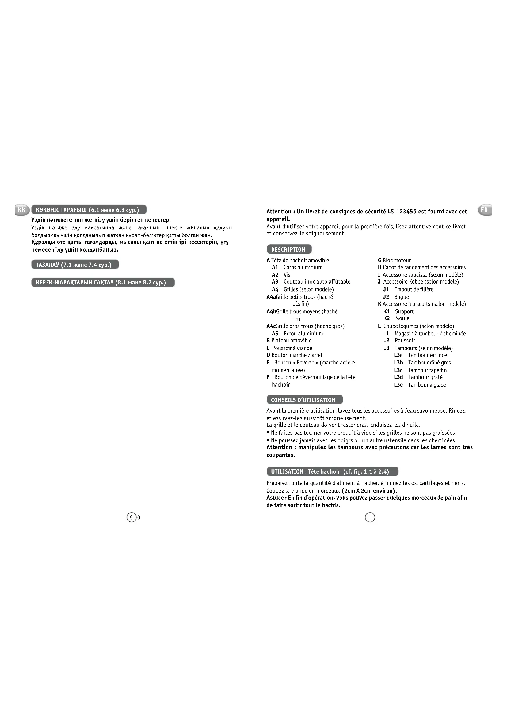 - Appuyez sur la position « I » du bouton marche/arrêt (D) pour continuer le hachage. ACCESSOIRE SAUCISSES (cf. fig. 3.1 à 3.6) Important : cet accessoire n’est à utiliser qu’après avoir haché la viande, avoir rajouté l’assaisonnement et avoir bien brassé la préparation. Après avoir laissé le boyau tremper dans de l’eau tiède pour retrouver son élasticité, enfilez-le sur l’entonnoir en laissant dépasser 5 cm (que vous obturerez en faisant un noeud avec un lien). Mettez en marche l’appareil, alimentez le hachoir en hachis et faire suivre le boyau à mesure que celui-ci se remplit. Nota : ce travail se fera plus facilement à deux, l’un s’occupera d’approvisionner en hachis, l’autre s’occupera du remplissage du boyau. Donner aux saucisses la longueur désirée en pinçant et en tournant le boyau. Pour avoir une saucisse de qualité, prenez soin d’éviter d’emprisonner de l’air lors du remplissage et faites des saucisses de 10 à 15 cm (séparez les saucisses en plaçant un lien et en faisant un noeud à l’aide de celui-ci). ACCESSOIRE KEBBE (cf. fig. 4.1 et 4.3) Conseil pratique : Pour la réalisation de la pâte fine de Kebbe ou Kefta, passer la viande 2 à 3 fois dans la tête de hachoir jusqu’à obtention de la finesse désirée. ACCESSOIRE À BISCUITS (cf. fig. 5.1 à 5.3) Préparez la pâte. Vous obtiendrez de meilleurs résultats avec une pâte un peu molle. Choisissez le dessin en faisant correspondre la flèche et la forme choisie. Approvisionnez jusqu’à ce que vous ayiez obtenu la quantité de biscuits désirée. COUPE LÉGUMES (cf. fig.6.1 à 6.3) Conseils pour obtenir de bons résultats : Les ingrédients que vous utilisez doivent être fermes pour obtenir des résultats satisfaisants et éviter toute accumulation d’aliment dans le magasin. Ne pas utiliser l’appareil pour râper ou trancher des aliments trop durs tels que du sucre ou des morceaux de viande. NETTOYAGE (cf. fig. 7.1 à 7.4) RANGEMENT DES ACCESSOIRES (cf. fig 8.1 à 8.2) FR FR13 14 Note: Safety instruction booklet LS-123456 is supplied with the appliance. Before using your appliance for the first time, read the booklet carefully and keep it in a safe place. DESCRIPTION A Removable mincer head A1 Aluminium casing A2 Screw A3 Self-sharpening stainless steel blade A4 Grilles (depending on model) A4a Small-hole grille (very fine mincing) A4b Medium-hole grille (fine mincing) A4c Large-hole grille (coarse mincing) A5 Aluminium nut B Removable tray C Meat pusher D On/off button E «Reverse» button (short reverse movement) F Mincer head release button G Motor unit H Accessory storage cover I Sausage accessory (depending on model) J Kebbe accessory (depending on model) J1 Die end piece J2 Ring K Biscuit maker accessory (depending on model) K1 Support K2 Mould L Vegetable chopper (depending on model) L1 Drum body/feed tube L2 Pusher L3 Drums (depending on model) L3a Slicing drum L3b Coarse grating drum L3c Fine grating drum L3d Scraper drum L3e Ice shaving drum USE Before using for the first time, wash all the accessories in soapy water. Rinse and dry them carefully. The grille and the blade should be lightly greased. Coat them with oil.