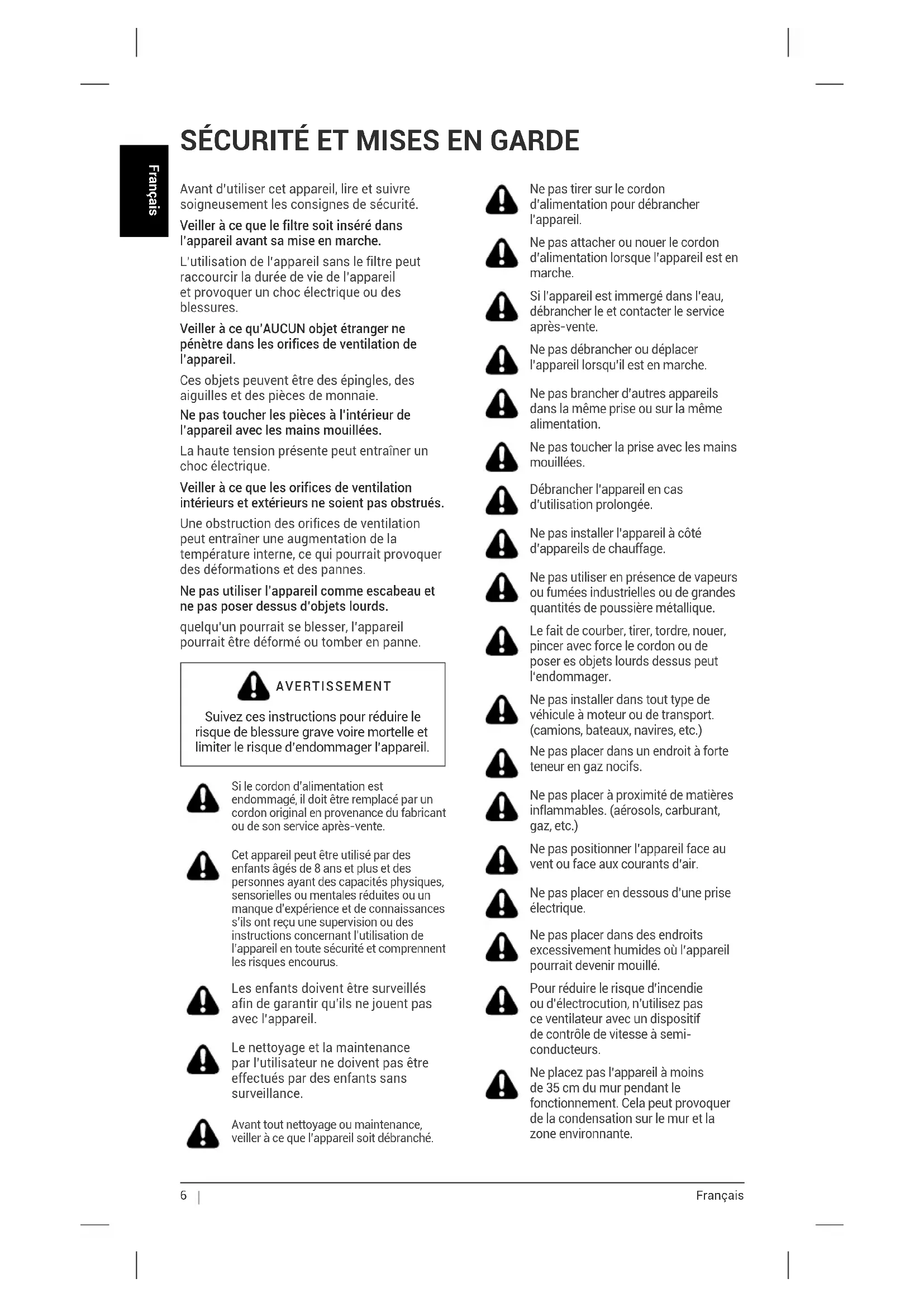 Avant d’utiliser cet appareil, lire et suivre soigneusement les consignes de sécurité. Veiller à ce que le filtre soit inséré dans l’appareil avant sa mise en marche. L’utilisation de l’appareil sans le filtre peut raccourcir la durée de vie de l’appareil et provoquer un choc électrique ou des blessures. Veiller à ce qu’AUCUN objet étranger ne pénètre dans les orifices de ventilation de l’appareil. Ces objets peuvent être des épingles, des aiguilles et des pièces de monnaie. Ne pas toucher les pièces à l’intérieur de l’appareil avec les mains mouillées. La haute tension présente peut entraîner un choc électrique. Veiller à ce que les orifices de ventilation intérieurs et extérieurs ne soient pas obstrués. Une obstruction des orifices de ventilation peut entraîner une augmentation de la température interne, ce qui pourrait provoquer des déformations et des pannes. Ne pas utiliser l’appareil comme escabeau et ne pas poser dessus d’objets lourds. quelqu’un pourrait se blesser, l’appareil pourrait être déformé ou tomber en panne. AVERTISSEMENT Suivez ces instructions pour réduire le risque de blessure grave voire mortelle et limiter le risque d’endommager l’appareil. Si le cordon d’alimentation est endommagé, il doit être remplacé par un cordon original en provenance du fabricant ou de son service après-vente. Cet appareil peut être utilisé par des enfants âgés de 8 ans et plus et des personnes ayant des capacités physiques, sensorielles ou mentales réduites ou un manque d’expérience et de connaissances s’ils ont reçu une supervision ou des instructions concernant l’utilisation de l’appareil en toute sécurité et comprennent les risques encourus. Les enfants doivent être surveillés afin de garantir qu’ils ne jouent pas avec l’appareil. Le nettoyage et la maintenance par l’utilisateur ne doivent pas être effectués par des enfants sans surveillance. Avant tout nettoyage ou maintenance, veiller à ce que l’appareil soit débranché. Ne pas tirer sur le cordon d’alimentation pour débrancher l’appareil. Ne pas attacher ou nouer le cordon d’alimentation lorsque l’appareil est en marche. Si l’appareil est immergé dans l’eau, débrancher le et contacter le service après-vente. Ne pas débrancher ou déplacer l’appareil lorsqu’il est en marche. Ne pas brancher d’autres appareils dans la même prise ou sur la même alimentation. Ne pas toucher la prise avec les mains mouillées. Débrancher l’appareil en cas d’utilisation prolongée. Ne pas installer l’appareil à côté d’appareils de chauffage. Ne pas utiliser en présence de vapeurs ou fumées industrielles ou de grandes quantités de poussière métallique. Le fait de courber, tirer, tordre, nouer, pincer avec force le cordon ou de poser es objets lourds dessus peut l‘endommager. Ne pas installer dans tout type de véhicule à moteur ou de transport. (camions, bateaux, navires, etc.) Ne pas placer dans un endroit à forte teneur en gaz nocifs. Ne pas placer à proximité de matières inflammables. (aérosols, carburant, gaz, etc.) Ne pas positionner l’appareil face au vent ou face aux courants d’air. Ne pas placer en dessous d’une prise électrique. Ne pas placer dans des endroits excessivement humides où l’appareil pourrait devenir mouillé. Pour réduire le risque d’incendie ou d’électrocution, n’utilisez pas ce ventilateur avec un dispositif de contrôle de vitesse à semi- conducteurs. Ne placez pas l’appareil à moins de 35 cm du mur pendant le fonctionnement. Cela peut provoquer de la condensation sur le mur et la zone environnante. SÉCURITÉ ET MISES EN GARDEFrançais Français