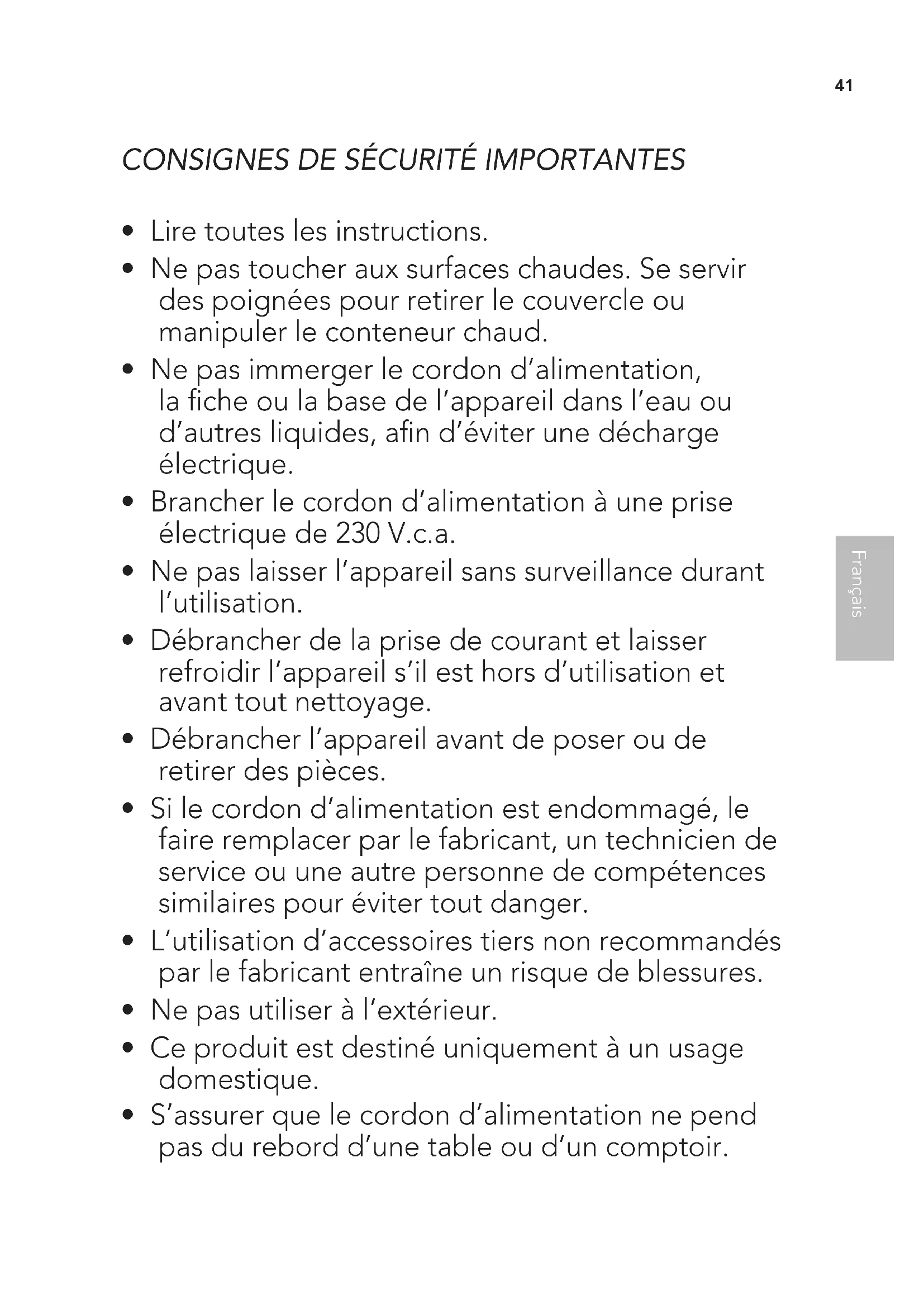- Pour réduire le risque de choc électrique, cuisiner uniquement dans la casserole amovible. Ne jamais verser d’eau, ni d’aliments dans la casserole extérieure.
