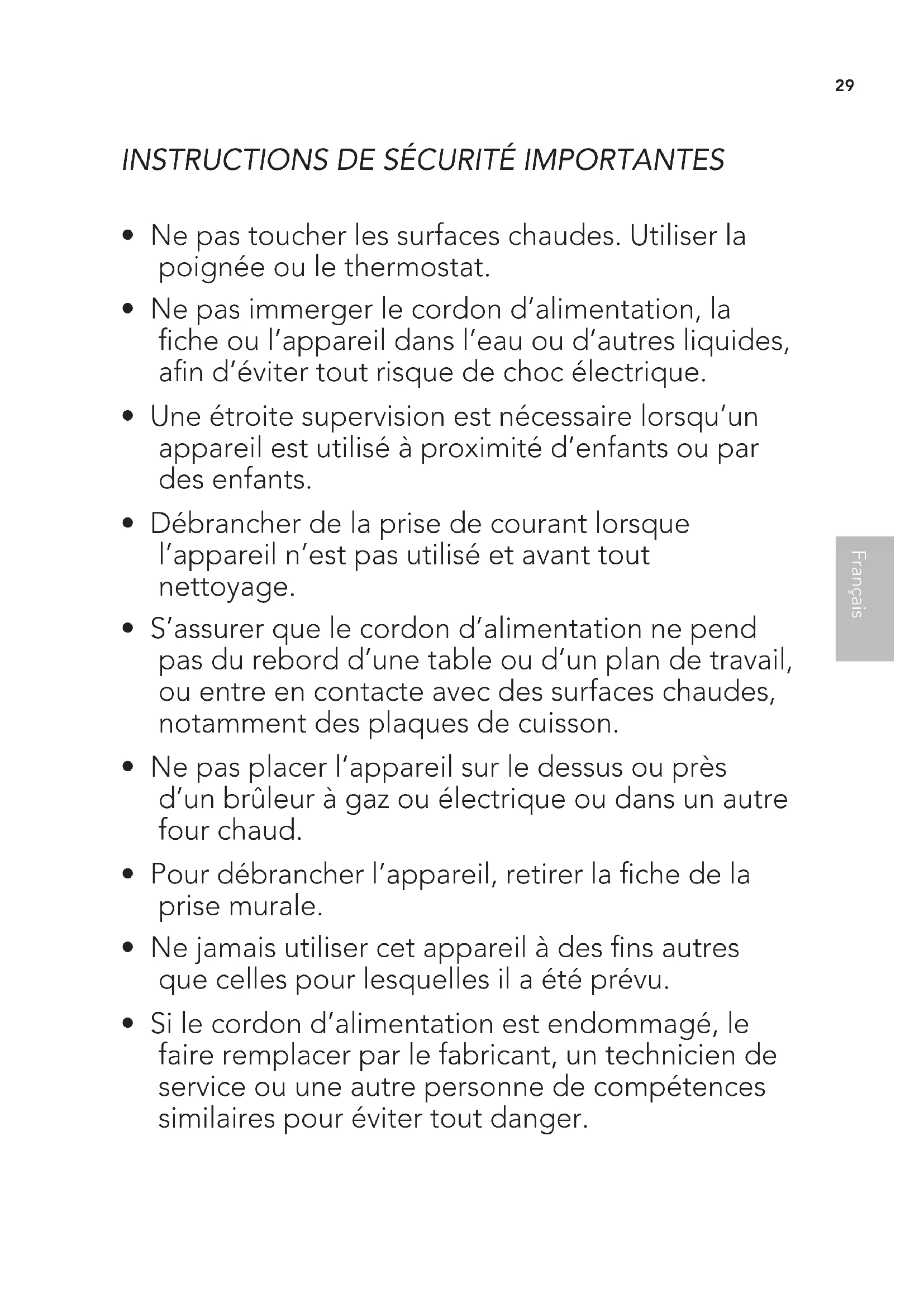 - Ne pas toucher les surfaces chaudes. Utiliser la poignée ou le thermostat.