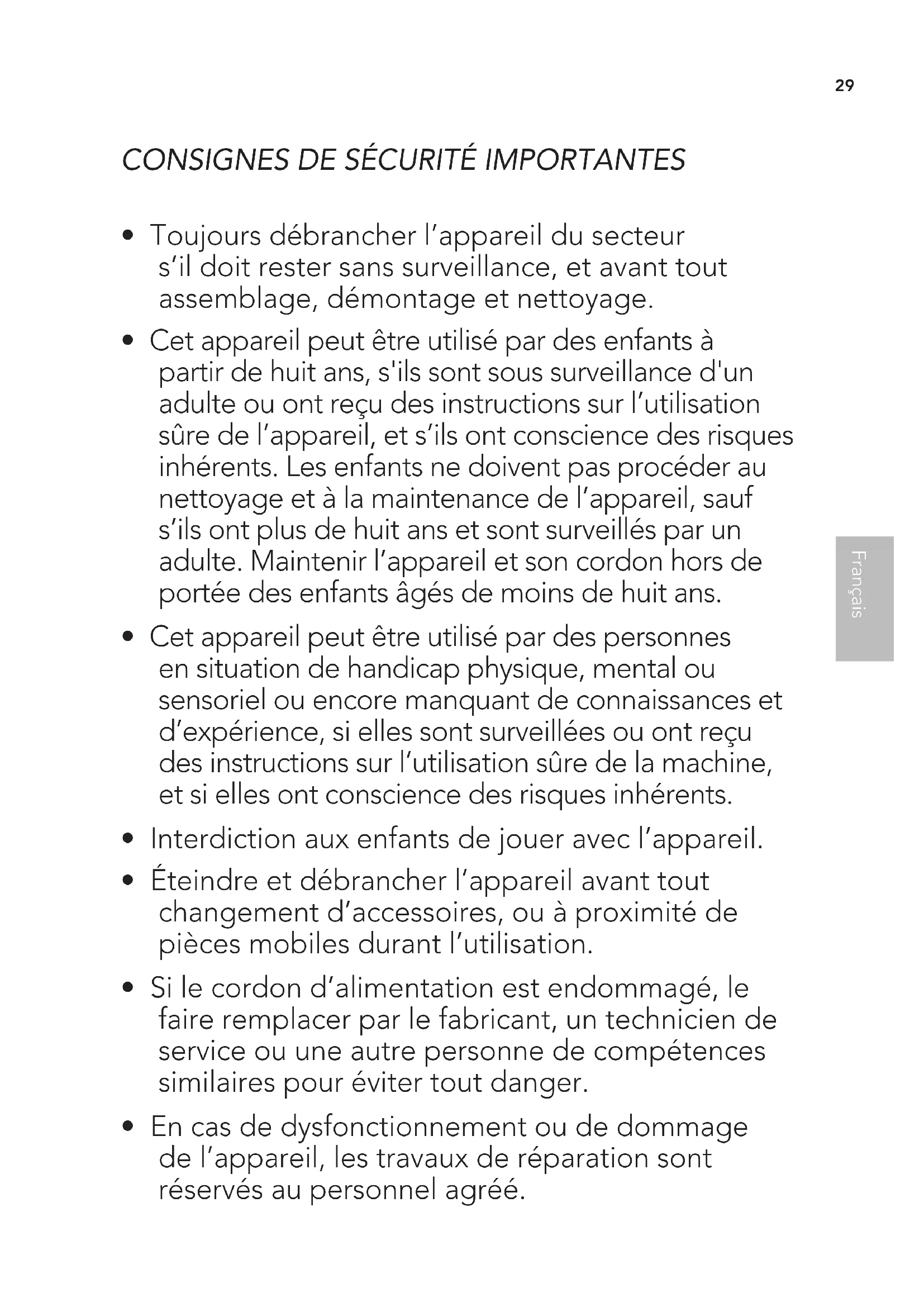 - Cet appareil peut être utilisé par des personnes en situation de handicap physique, mental ou sensoriel ou encore manquant de connaissances et d’expérience, si elles sont surveillées ou ont reçu des instructions sur l’utilisation sûre de la machine, et si elles ont conscience des risques inhérents.