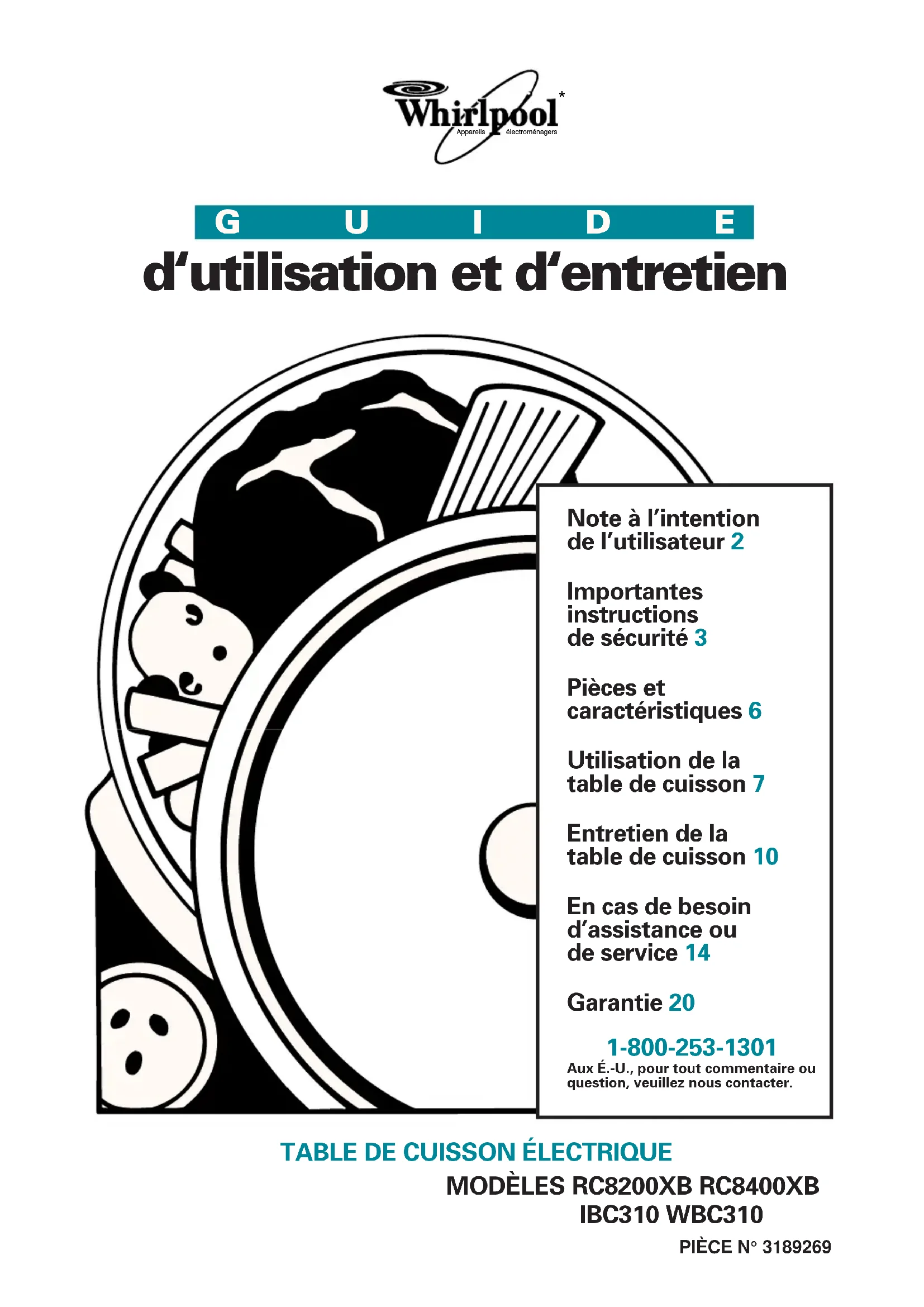IBC310 WBC310 Note à l’intention de l’utilisateur 2 Importantes instructions de sécurité 3 Pièces et caractéristiques 6 Utilisation de la table de cuisson 7 Entretien de la table de cuisson 10 En cas de besoin d’assistance ou de service 14 Garantie 20 1-800-253-1301 Aux É.-U., pour tout commentaire ouquestion, veuillez nous contacter. GUIDE d‘utilisation et d‘entretien Appareils électroménagers