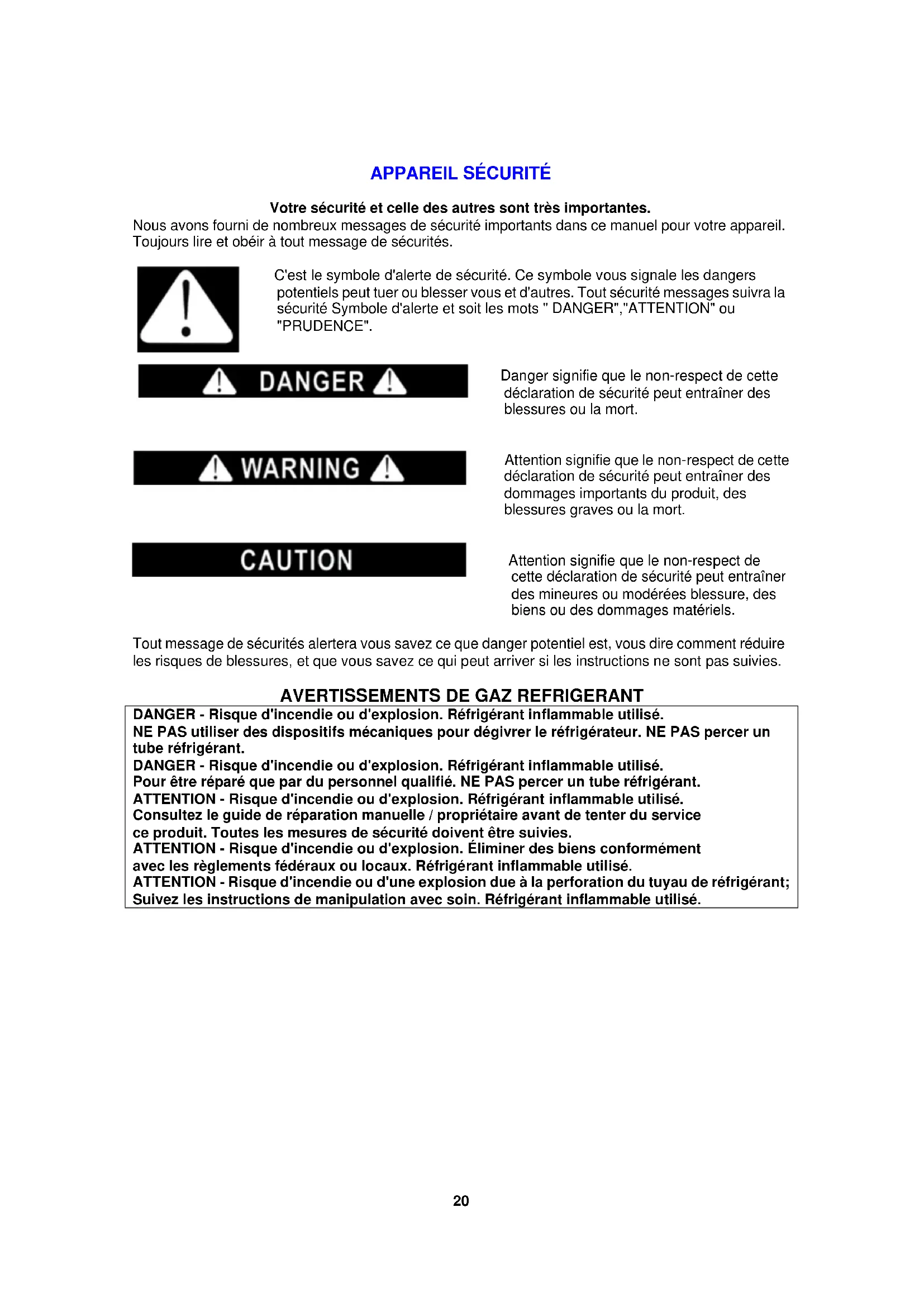 DANGER - Risque d'incendie ou d'explosion. Réfrigérant inflammable utilisé. NE PAS utiliser des dispositifs mécaniques pour dégivrer le réfrigérateur. NE PAS percer un tube réfrigérant. DANGER - Risque d'incendie ou d'explosion. Réfrigérant inflammable utilisé. Pour être réparé que par du personnel qualifié. NE PAS percer un tube réfrigérant. ATTENTION - Risque d'incendie ou d'explosion. Réfrigérant inflammable utilisé. Consultez le guide de réparation manuelle / propriétaire avant de tenter du service ce produit. Toutes les mesures de sécurité doivent être suivies. ATTENTION - Risque d'incendie ou d'explosion. Éliminer des biens conformément avec les règlements fédéraux ou locaux. Réfrigérant inflammable utilisé. ATTENTION - Risque d'incendie ou d'une explosion due à la perforation du tuyau de réfrigérant; Suivez les instructions de manipulation avec soin. Réfrigérant inflammable utilisé.21