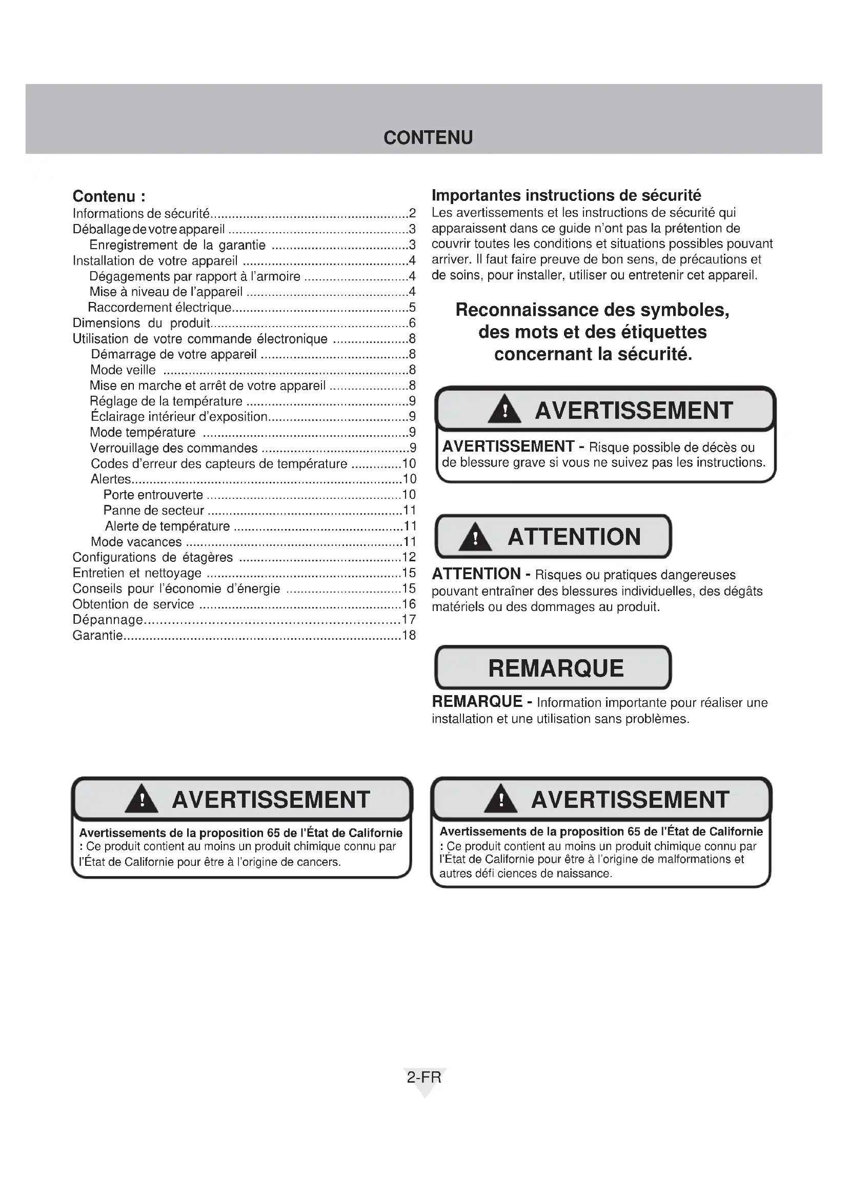 - ATTENTION Importantes instructions de sécurité Les avertissements et les instructions de sécurité qui apparaissent dans ce guide n’ont pas la prétention de couvrir toutes les conditions et situations possibles pouvant arriver. Il faut faire preuve de bon sens, de précautions et de soins, pour installer, utiliser ou entretenir cet appareil. Reconnaissance des symboles, des mots et des étiquettes concernant la sécurité. ATTENTION - Risques ou pratiques dangereuses pouvant entraîner des blessures individuelles, des dégâts matériels ou des dommages au produit. REMARQUE - Information importante pour réaliser une installation et une utilisation sans problèmes. Contenu : Informations de sécurité p. 2